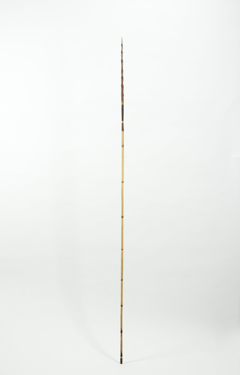 Kétrészes nyílvessző. A bambuszból készült szárba növényi rosttal rögzítették a fából készült hegyet, melyhez ugyancsak növényi rostzsinórral tüskéből készült szakákat erősítettek. Rost tekercseléssel erősítették meg a nyílvessző végén található rovátkát is, ami a nyílvesszőnek az íj húrjába történő beillesztését segítette.