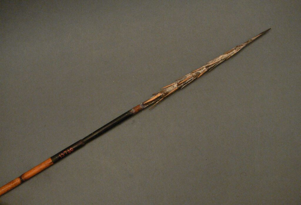 Kétrészes nyílvessző. A bambuszból készült szárba fából készült hegyet illesztettek, melyhez ragasztóanyaggal átitatott növényi rostzsinórral csontszakákat erősítettek, majd fehér festéssel díszítettek. A szárba hat helyen egyenes vonalakból alkotott geometrikus mintát égettek.