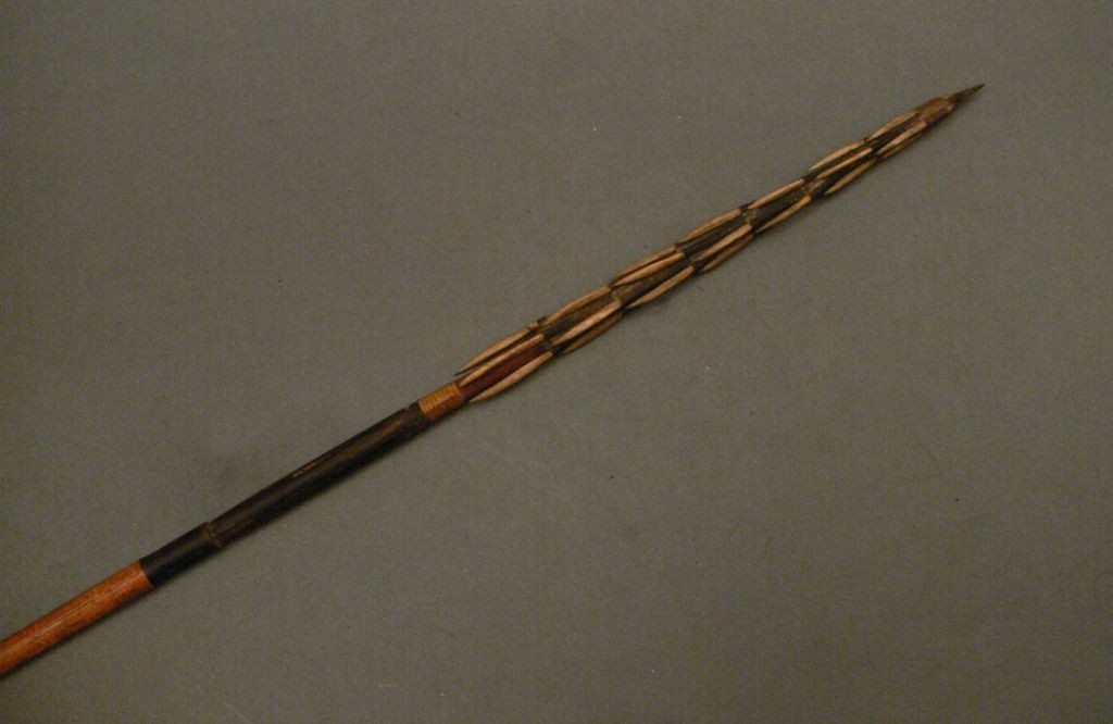 Kétrészes nyílvessző. A bambuszból készült szárba fából készült hegyet illesztettek, melyhez ragasztóanyaggal átitatott növényi rostzsinórral csontszakákat erősítettek. Rosttekercseléssel erősítették meg a nyílvessző végén található rovátkát is, ami a nyílvesszőnek az íj húrjába történő beillesztését segítette. A szárba hat helyen egyenes vonalakból alkotott geometrikus mintát égettek.