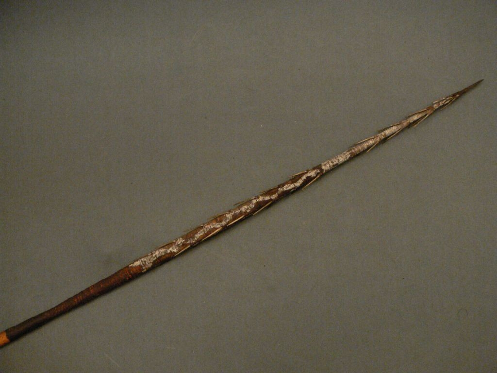 Kétrészes nyílvessző. A bambuszból készült szárba növényi rosttal rögzítették a fából készült hegyet, melyhez ugyancsak növényi rostzsinórral tüskéből készült szakákat erősítettek. Rosttekercseléssel erősítették meg a nyílvessző végén található rovátkát is, ami a nyílvesszőnek az íj húrjába történő beillesztését segítette.