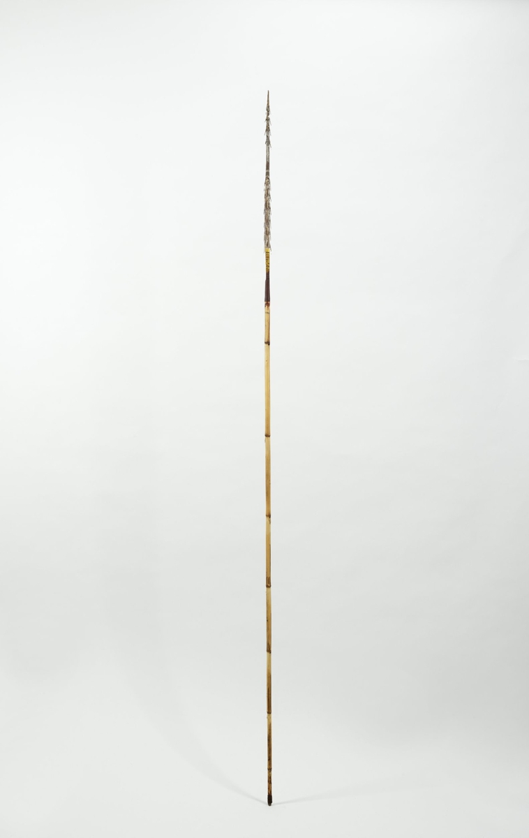 Kétrészes nyílvessző. A bambuszból készült szárba növényi rosttal rögzítették a fából készült hegyet, melyhez ugyancsak növényi rostzsinórral tüskéből készült szakákat erősítettek. Rosttekercseléssel erősítették meg a nyílvessző végén található rovátkát is, ami a nyílvesszőnek az íj húrjába történő beillesztését segítette.