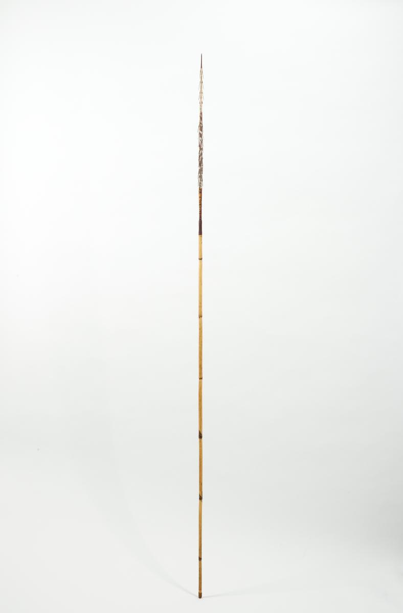 Kétrészes nyílvessző. A bambuszból készült szárba növényi rosttal rögzítették a fából készült hegyet, melyhez ugyancsak növényi rostzsinórral tüskéből készült szakákat erősítettek. Rosttekercseléssel erősítették meg a nyílvessző végén található rovátkát is, ami a nyílvesszőnek az íj húrjába történő beillesztését segítette. A szárba három helyen hosszanti irányban futó vonalakból álló mintát égettek.