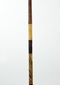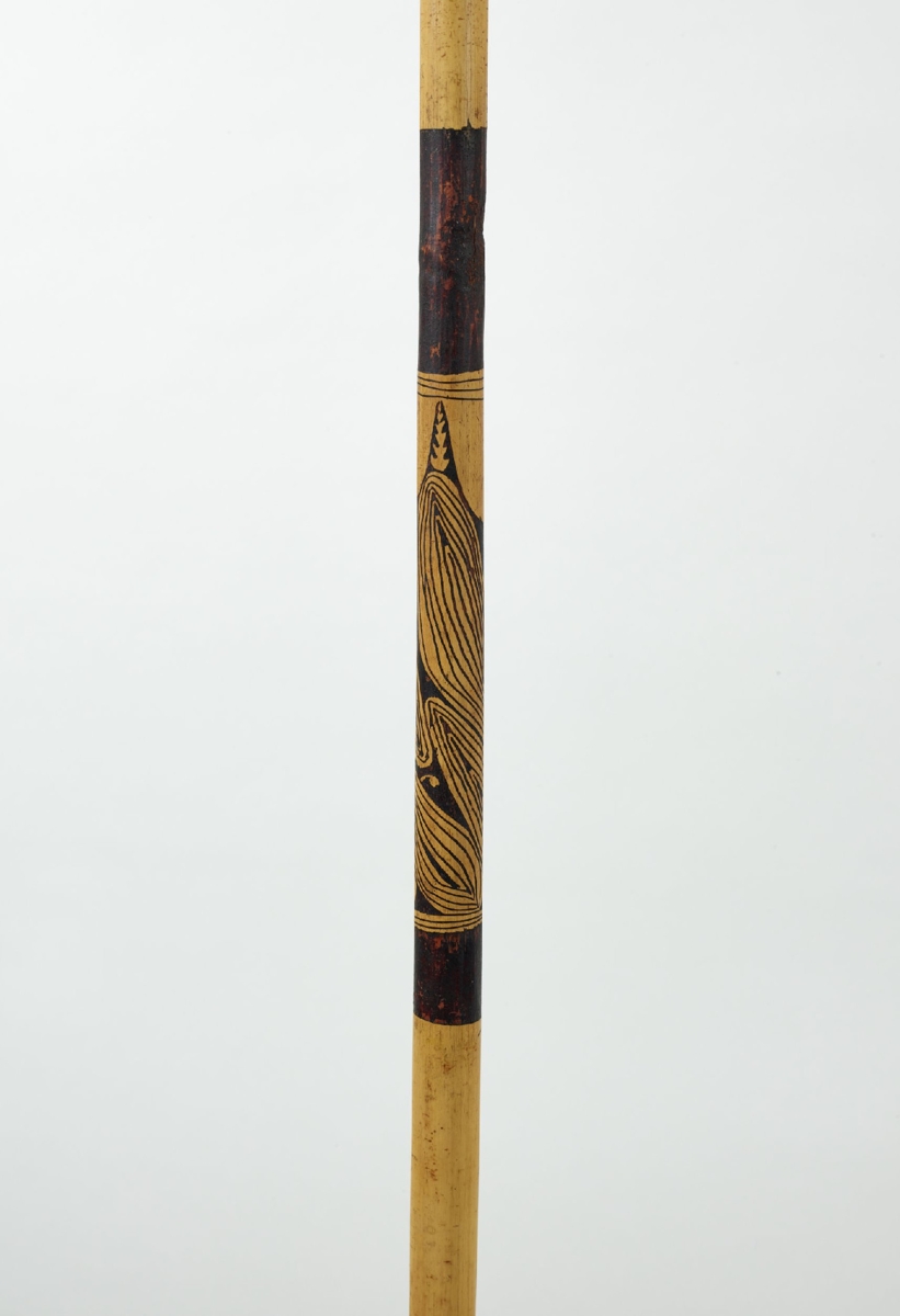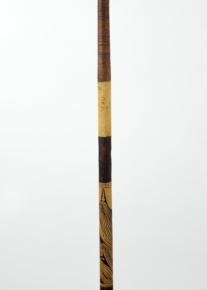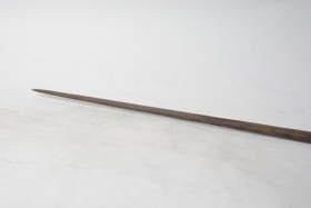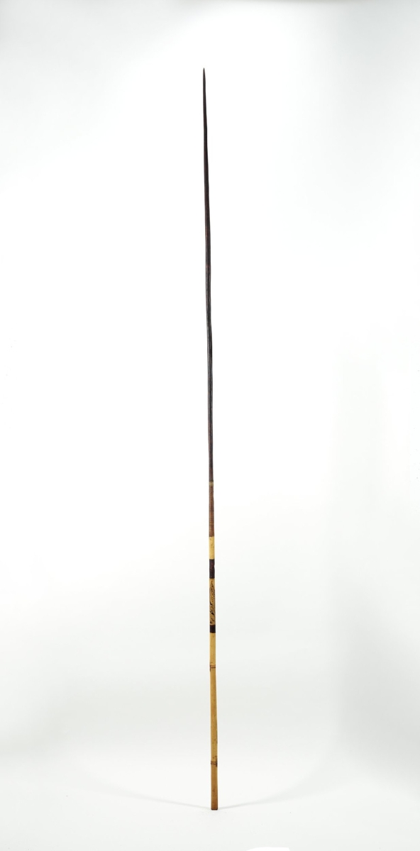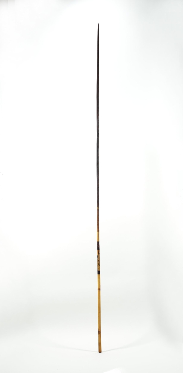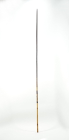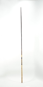 Hosszú, sötétbarna hegy, mely bambusz szárhoz van rögzítve. A szár egy részén fekete festék, belekarcolt geometrikus motívumokkal.