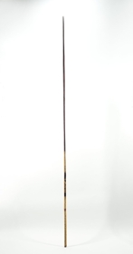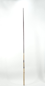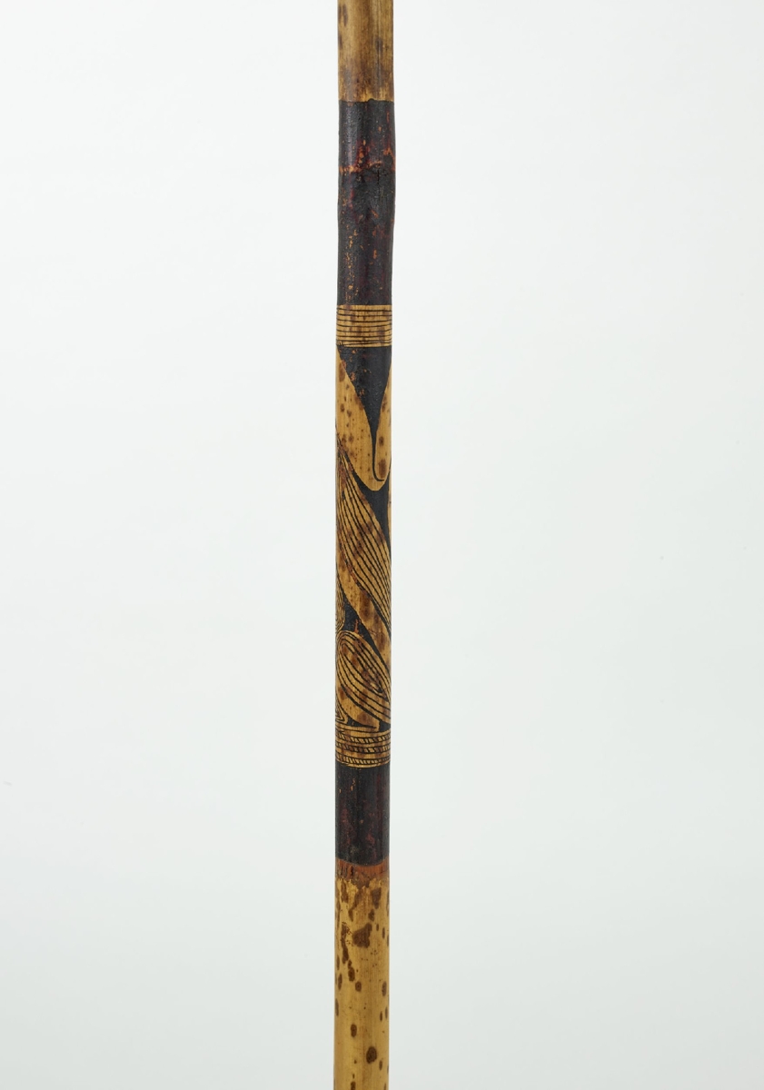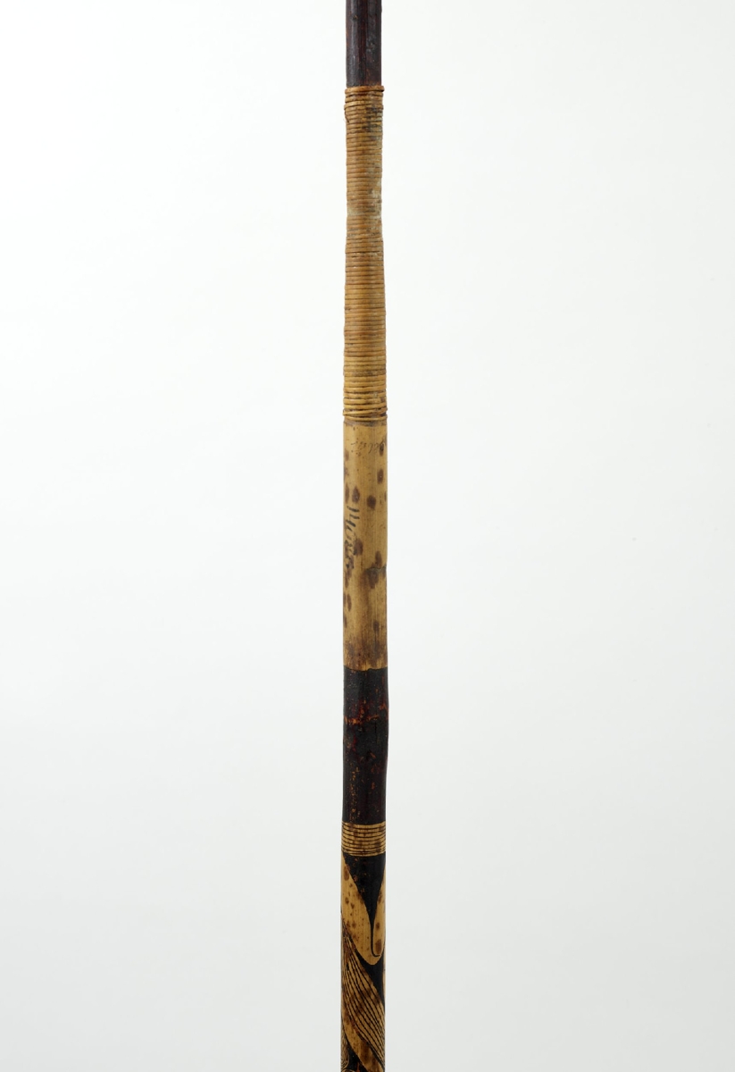 Kétrészes, nyele világosbarna, felső végén geometrikus motívumokkal díszített nád, melyet fonattal erősítettek a fahegyhez.