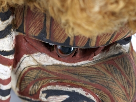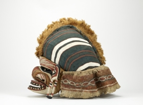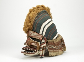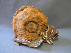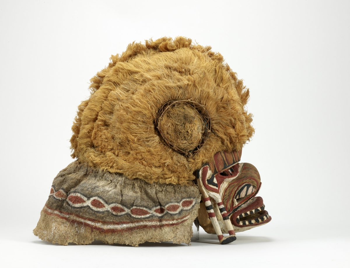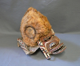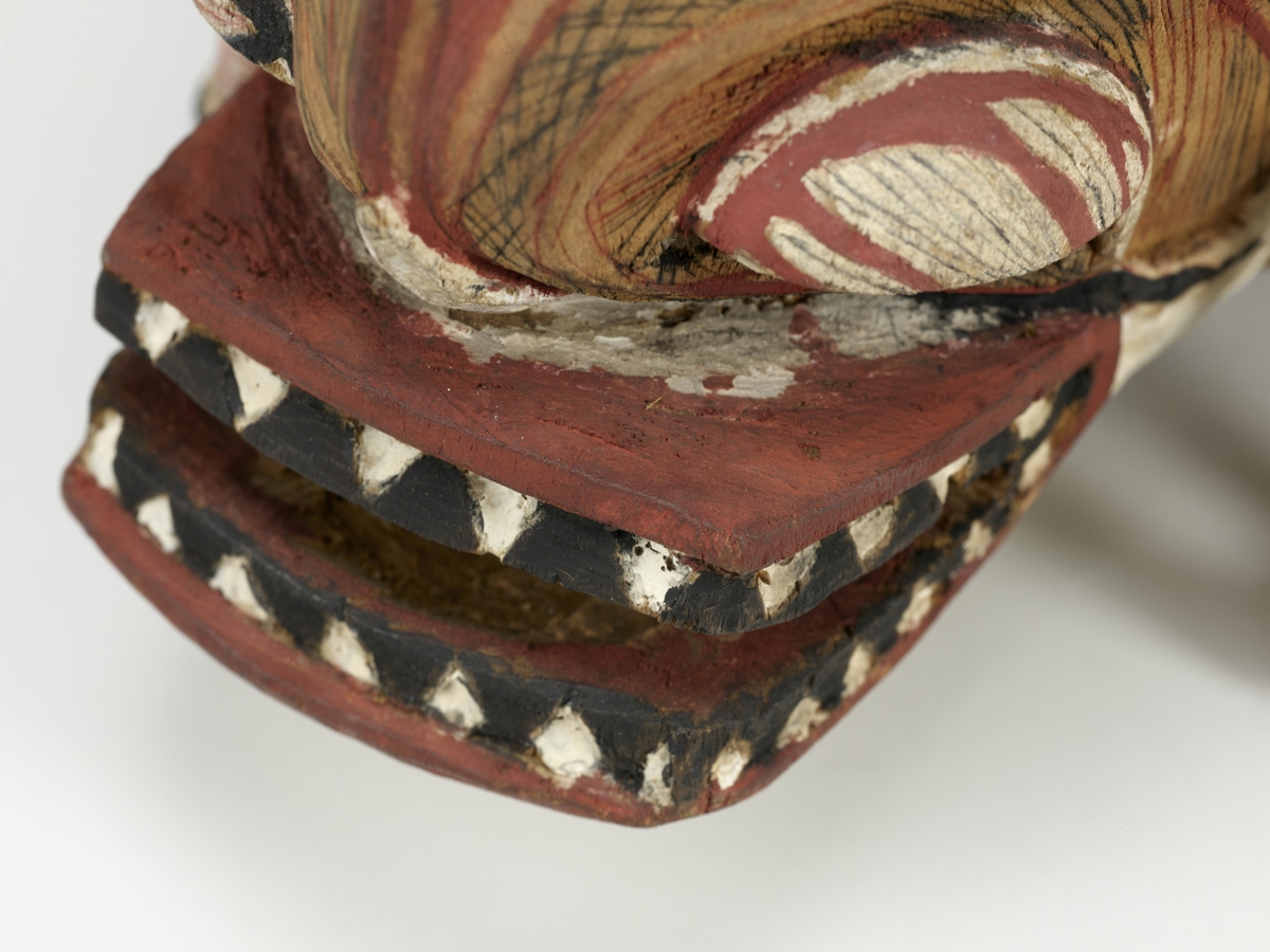 Két részből áll. Arcrésze puhafa anyagból faragott. Az orr hajlott, a száj, a szemek és az orrcimpák áttörten faragottak. Kétoldalt téglalap alapú nyílással bíró fülek. A szemnyílásokon korong alakú, zöldes kőzetdarabok jelzik a szemeket. A vonalas díszítések fehér, fekete, barnás és vörös színűek. A szájnyílás körül váltakozó fekete és fehér háromszögek jelzik a fogakat. A fejrész alapját rotangcsíkból készített rácsozat és vastag barnás színű faháncsanyag képezi. A fej és az arcrész összeerősítése, az utóbbi peremébe fúrt lyukakon keresztül kötözéssel történik. A fej féloldala sárgás színű rostanyaggal van befedve, másik oldalán fehér, piros, zöldes sávozású európai eredetű textilanyag van. A fejét sárgás színű rostanyagból készített taréjszerű dísz osztja két részre s ezáltal a maszknak sisakszerű formát kölcsönöz. A fejrész pereméről faháncs csíkok lógnak le, ezeken vörös-fehér-fekete színű díszítések láthatók.
