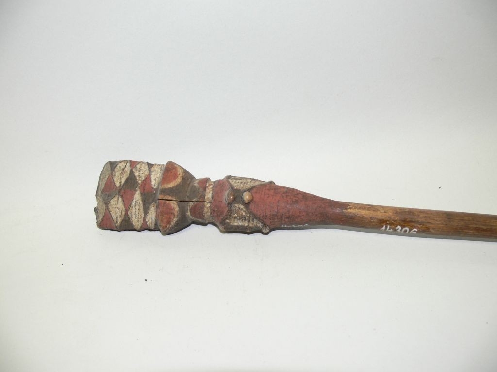 A lándzsa obszidián hegye hiányzik. A fa nyél teljes hosszúsága rögzítéssel együtt 1640,0 mm. A nyél átmérője közvetlenül a rögzítés alatt 14,9 mm, a nyél alsó végén 9,9 mm. A rögzítés teljes hossza 157,2 mm. Az alsó kötözés 73,4 mm hosszú, felfelé szélesedő; vörös alapon két fehérre festett rombusz, amelyek függőleges tengelyei az oldaléleken vannak, így az oldalakon két-két csúcsával szembe fordított háromszög látható. A rombuszok élei feketével festettek, a csúcsok a találkozási pontnál csapottak. A szélesebb fekete alapon két-két, az oldaléleken (a keskenyebb oldalakon, a rombuszok hossztengelyén) három-három mag. A foglalat és az alsó kötözés közötti fehér csík 6,3 mm széles. A rögzítés felső vége 77,5 mm hosszú, amiből a fa foglalat kehelyszerű alsó része 30,5 mm hosszú, három színnel festett. A felső kötözés mindkét oldalán, két függőleges oszlopban egymás felett, három-három csúcsaikkal egymásnak fordított fehér rombusz látható. A közöttük lévő síkot is rombuszok töltik ki, mégpedig úgy, hogy a rombuszok függőleges tengelyétől balra, illetve jobbra eső (alapjukkal találkozó) háromszögek ellentétes színekkel, vörösre, illetve feketére festettek. Ezek az egymás melletti rombuszok találkozó háromszögei különböző színűek (P4. ábra).
