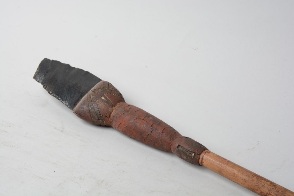 Az obszidián hegy disztális vége letörött. A törés alsó állású nyelves törés (a nyelv a törési felületnek a hátlap felőli oldalán helyezkedik el). A hegy hosszúsága [85,0] mm, szélessége 50,3 mm, vastagsága 16,8 mm (a proximális végén). Oldalnézetben egyenes profilú, szub-trapezoid keresztmetszetű, enyhén jobbra hajló pengén készült. A bal oldaléle retusált, a jobb oldalél retusálatlan. Mindkét oldalélen csorbulások láthatók.