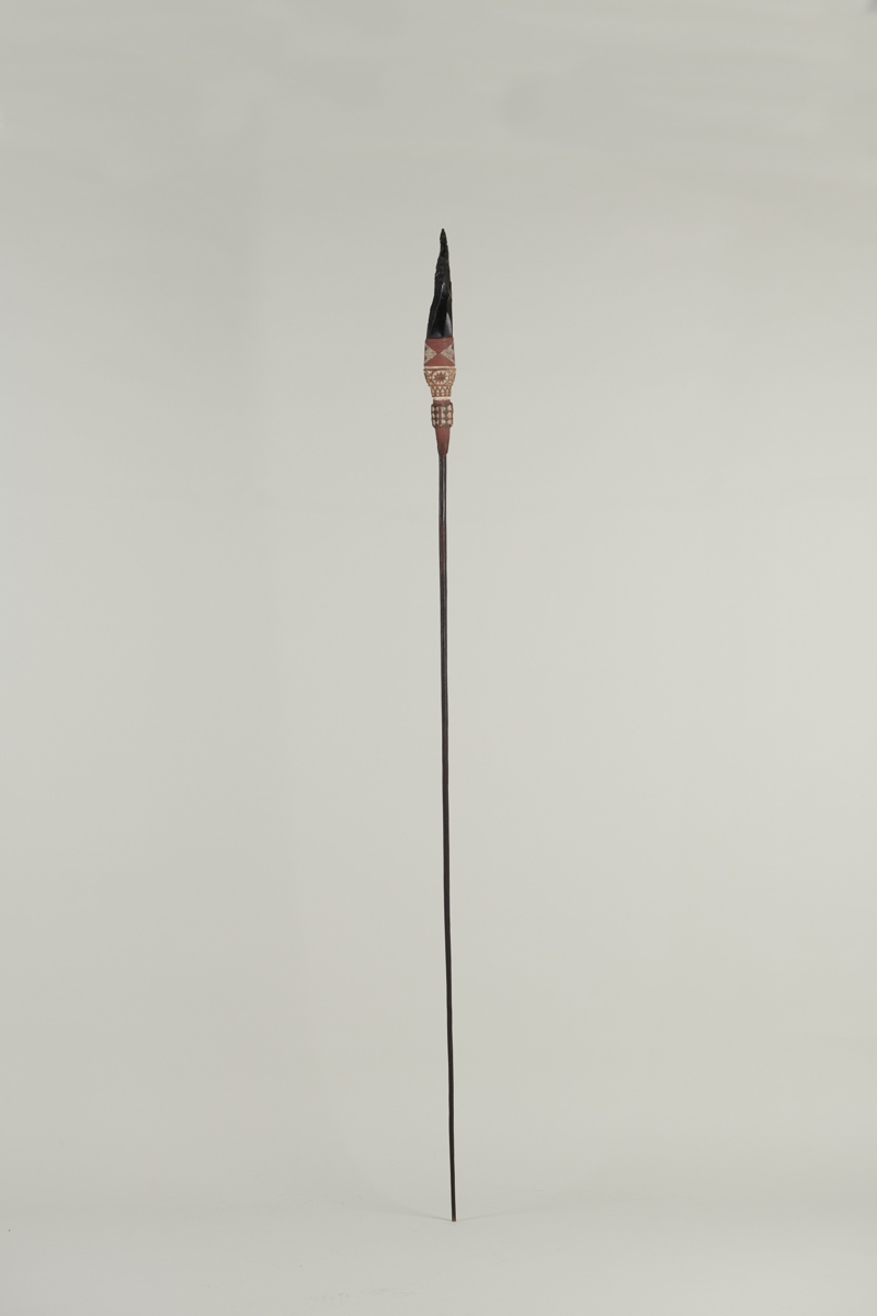 A fa nyél hosszúsága a rögzítéssel együtt 1695,0 mm. Átmérője közvetlenül a rögzítés alatt 15,0 mm, a nyél alsó végén 7,9 mm. A rögzítés hossza 221,7 mm. Alsó része 102,5 mm hosszú, amelynek felső 44,7 mm-es szakaszán, az oldalakon, fehérre festett alapon, két-két oszlopban, négy-négy egymás feletti rombusz. Az oldalakon és az oldaléleken is, 6,2 mm szélességű, 4,0-4,5 mm magasságú, vörös színű kiemelkedő gerincek; végeiken egy-egy mag. Egy 6,6 mm széles fehér sáv után, a 'kehely-szerű' fa foglalat 52,6 mm hosszú. Az alsó 20,0 mm-es részén fehérre festett, metszett háromszögek, egymás felett három sorban. A felső sor háromszögei alapjukkal felfelé néznek, az alsó és középső sor háromszögeinek a talpai összefordítottak, kööttük 2,5 mm vörös csík. A fa foglalat felső része 32,6 mm hosszú. Az oldalakon, illetve az oldaléleken körbeárkolt, ellipszis alakú, metszett 'szirmos virág' motívum. A szirmok száma változó, a felső oldaltól kezdve az óramutató járása szerint tíz ‒ tizenhárom ‒ kilenc ‒ tizennégy. Az olalakon lévő 'virágok' közepe bemélyített, vörösre festett; az oldaléleken levőké körbeárkolt, kisebb méretű, vörös színű.