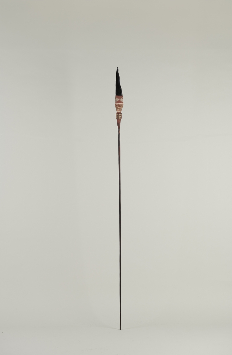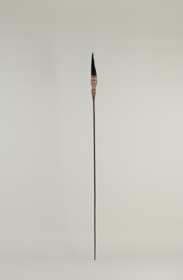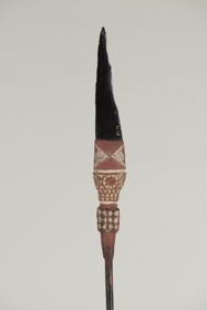 Háromrészes tárgy. Nyele hengeres, sötétbarna színű keményfa. Ehhez négy sor gyönggyel díszített kötözéssel, szépen faragott, feketére és vörösre festett, fehérrel inkrusztált farészt erősítettek. A farész kiszélesedő részéhez kötözéssel és aszfalt szerű anyaggal erősítettek a lapos, fekete színű, enyhén hajlott, hegyes obszidián pengét.
