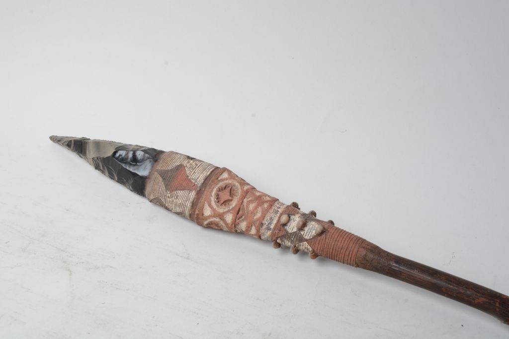 A fa nyél a díszített résszel együtt 1770,0 mm hosszú. Átmérője közvetlenül a díszítés alatt 17,0 mm, a nyél alsó végén 7,2 mm. A díszített rész hossza 205,0 mm. Az alsó 13,6 mm-es része festett, felette az alsó kötözés 67,3 mm hosszú., alsó része 30,6 mm hosszan vörösre festett. A felső részen fehér alapon, mindkét oldalon, festett háromszögekből és rombuszokból álló három soros geometrikus mintázat. Az alsó sorban két-két alapján álló vörös háromszög, a felső sor két-két vörös háromszöge a csúcsán áll. Az egymással szemben álló háromszögek között fekete rombuszok. A háromszögek, illetve rombuszok találkozásánál (négy oszlopban), egymás felett három-három mag. Egy 10,5 mm fehér sáv felett a díszített 'kehely-szerű' fa foglalat 56,5 mm hosszú. Alsó 23,0 mm-es részén, vörös alapon bemetszett fehér háromszögekből és vonalakból álló minta. Felső 33,5 mm hosszú részén, körben (az oldalakon és az oldaléleken is), ovális/ellipszis alapon, azonos nagyságú bemetszett konkáv oldalú rombuszok, farkasfog-szerűkörbeárkolással.