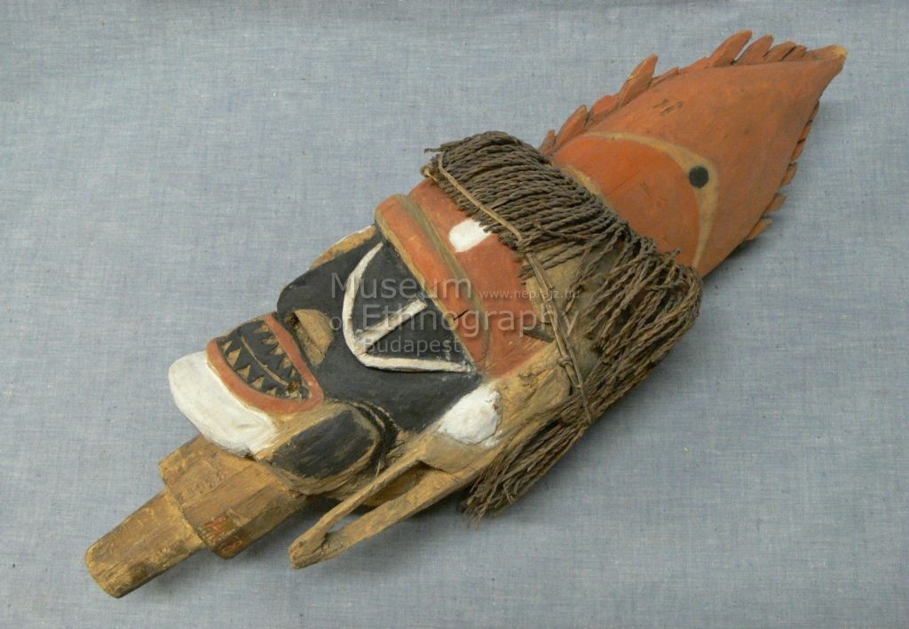 Könnyű faanyagból faragott, alul hengeres csapban végződő fej. Színe vörös és fekete. A fejen hosszú, lapos nyulvány emelkedik, ezt sötét növényi rostból fonott paróka veszi körül. A fül nyújtott és áttört. A nyúlvány egységesen vöröses színű, az arcon a vörös, fekete és fehér változik.