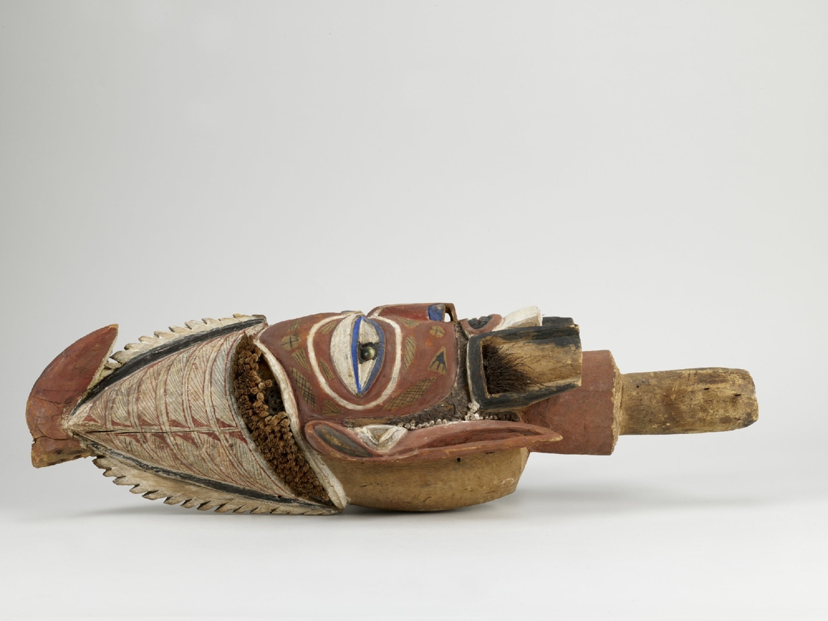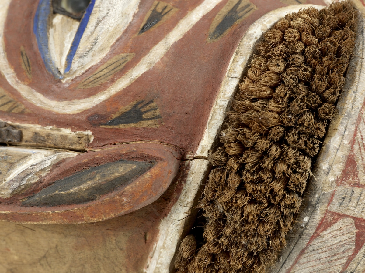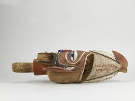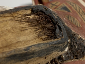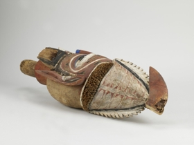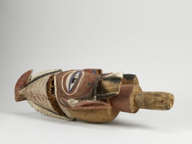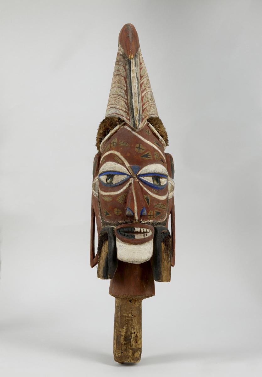 Puha fából faragott emberi fej, alul hengeres cövekkel. Az antropomorf arc két oldalán feketés növényi anyag. A fülek áttörten faragottak, az orr kiemelkedő, a szájban a fogakat rovátkolás jelzi. A fejdísz nyomott kúp, a homlok két oldalán sárgás növényi anyaggal. Díszítése fehér, fekete és vörös, foltokban és vonalkázottan elhelyezett színezés, a szem körül és az orrcimpán kék.