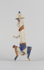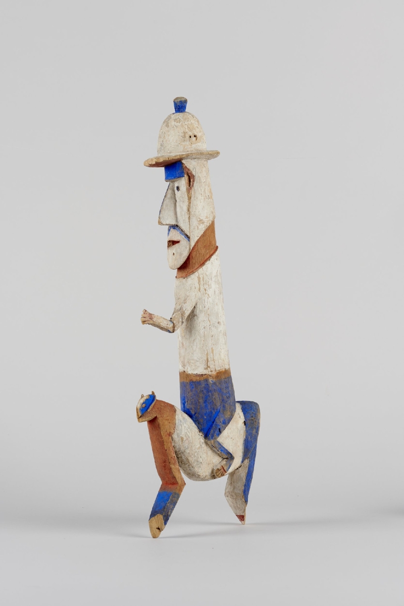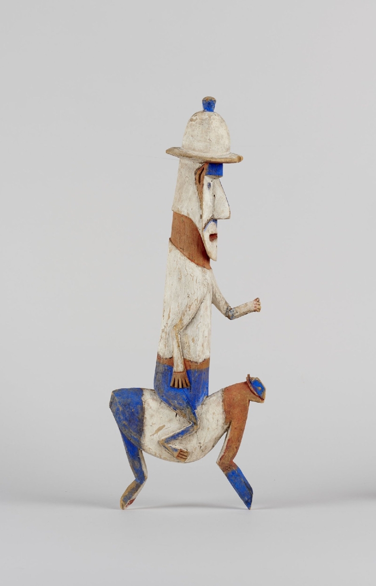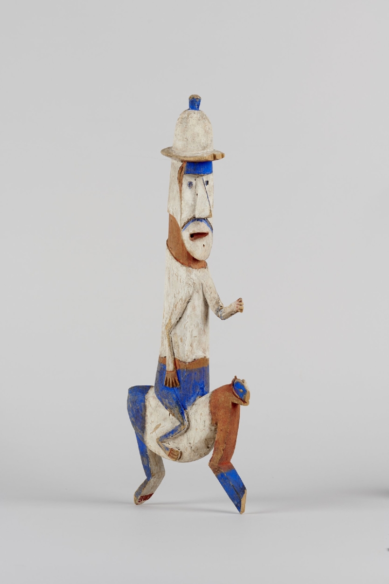 Puhafából faragott, lovon ülő parafasisakos európait ábrázoló szobor. Az állat 2-2 lába egyben van kifaragva, az emberalak aránytalanul hosszú az állathoz képest. Egyik karja reliefben, a másik szabadon faragott, előrenyúlik. Színezése: fehér, vörös és kék. A készítő valószínűleg nem vagy csak messziről látott lovat.