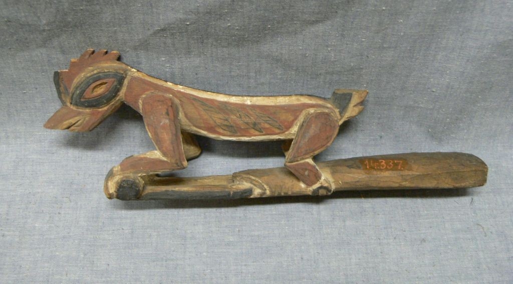 Egy darab fából faragott, barnás színű, vaskos nyélen álló, négy lábú madárfigura hosszú csőrrel, taréjjal, farokkal. A figura testét vörös, fehér és fekete festés és fekete vonalkázás díszíti.