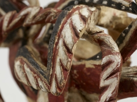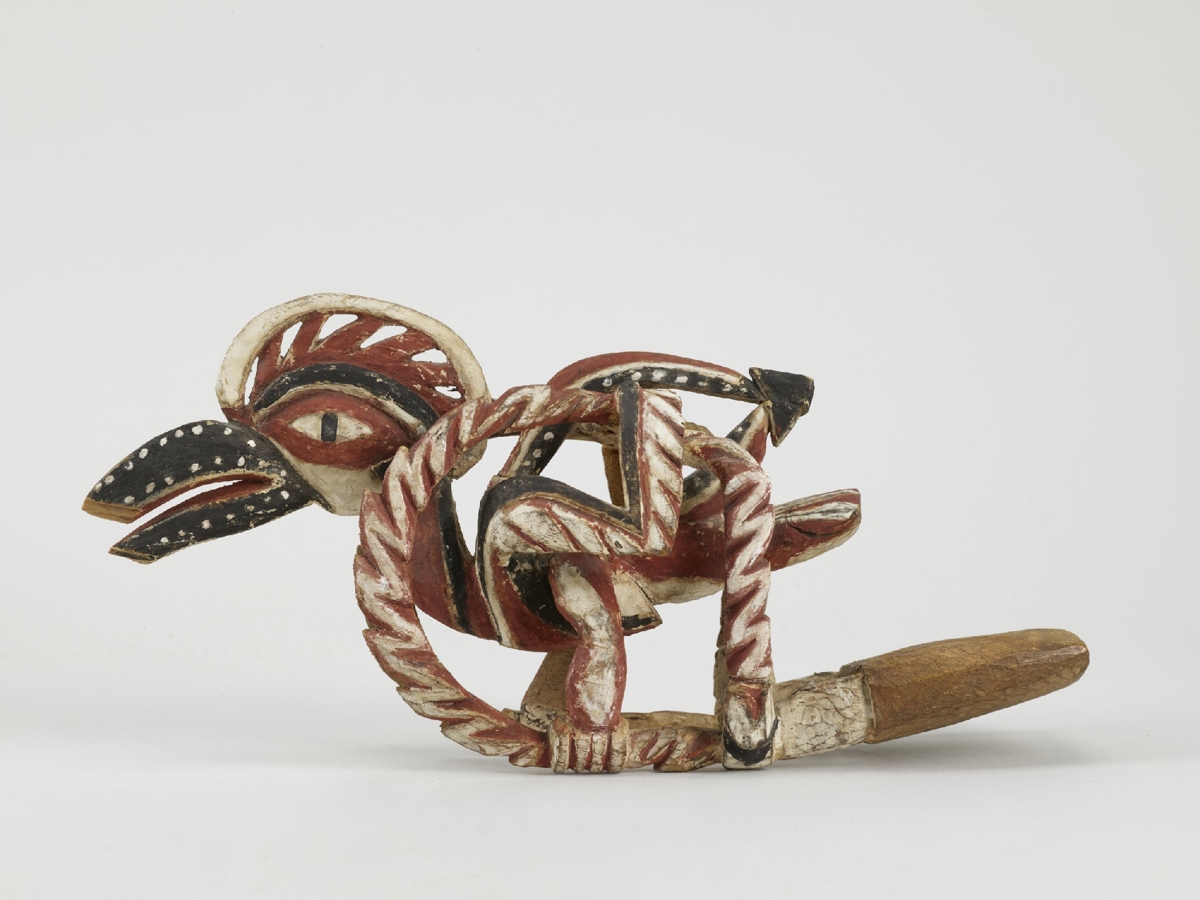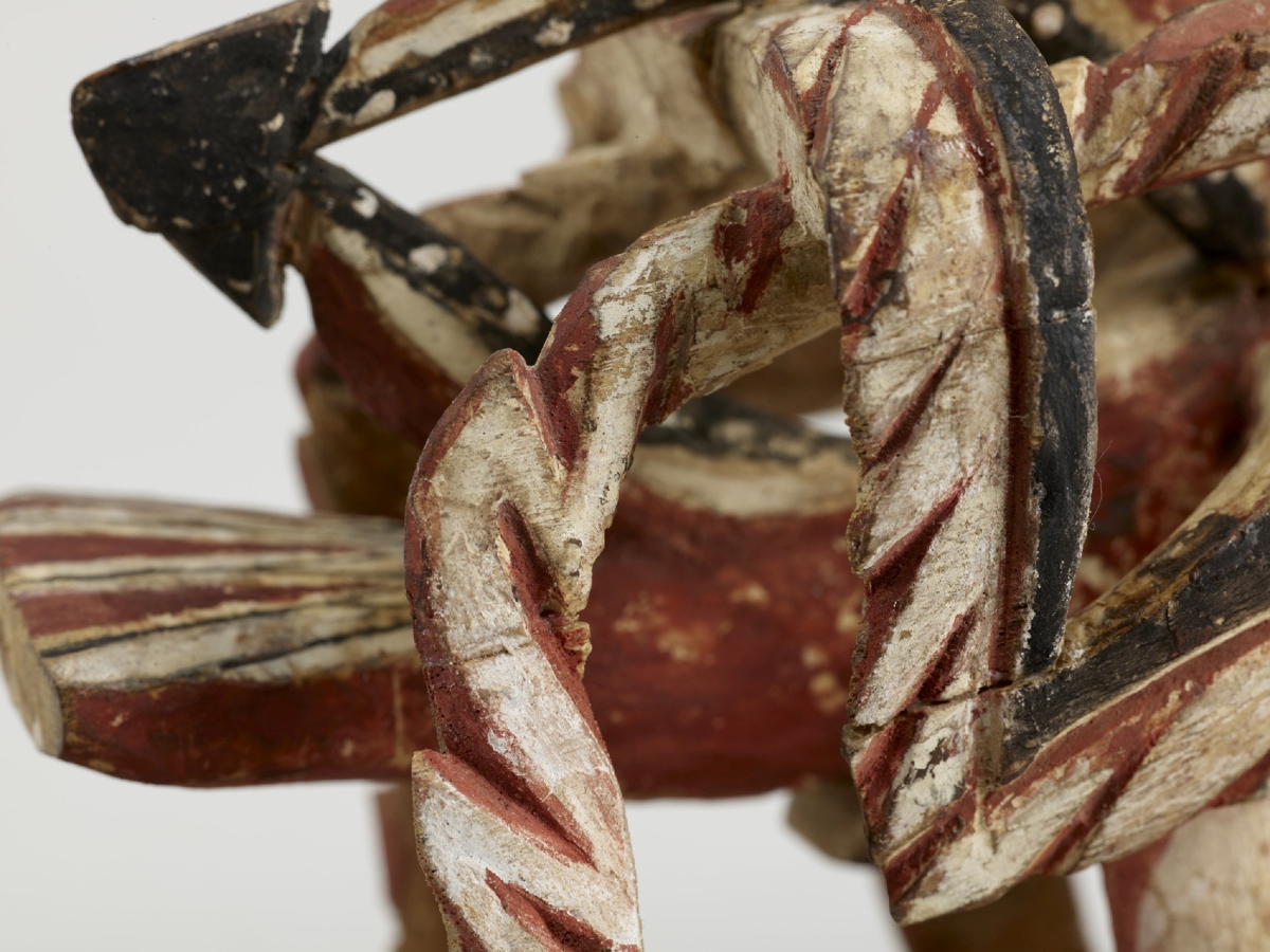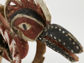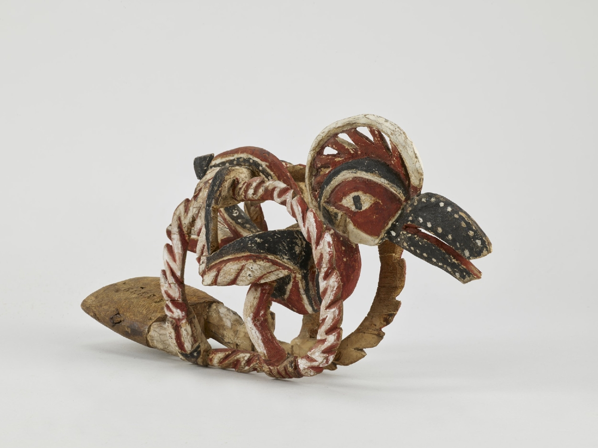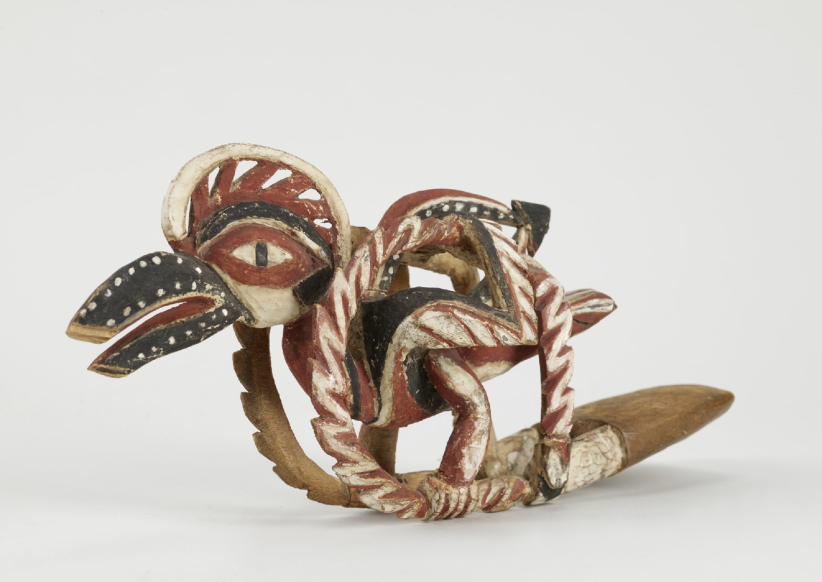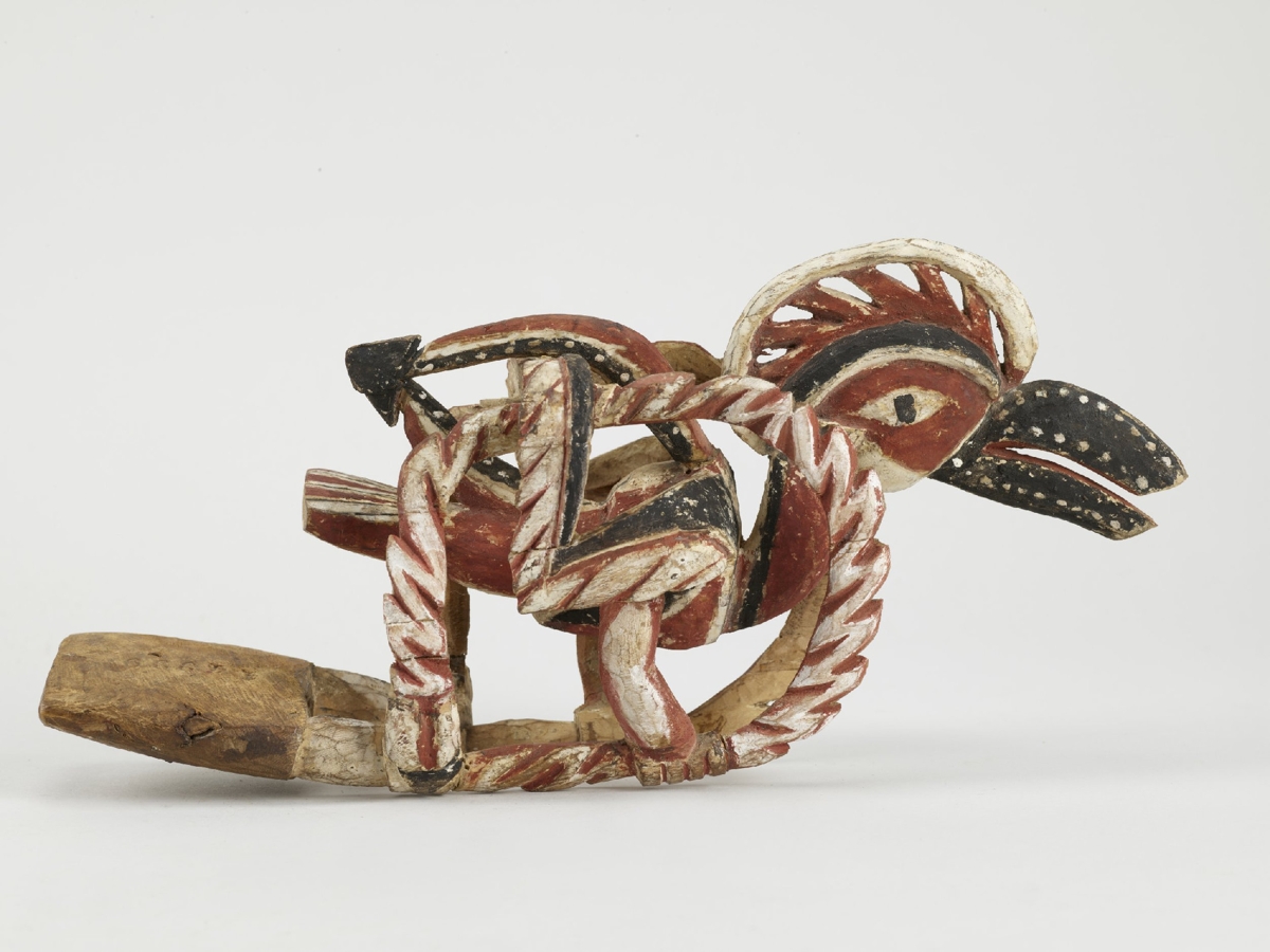 Könnyű fából faragott, madáralakú csónakorrdísz. Színezése fehér, fekete és vörös.