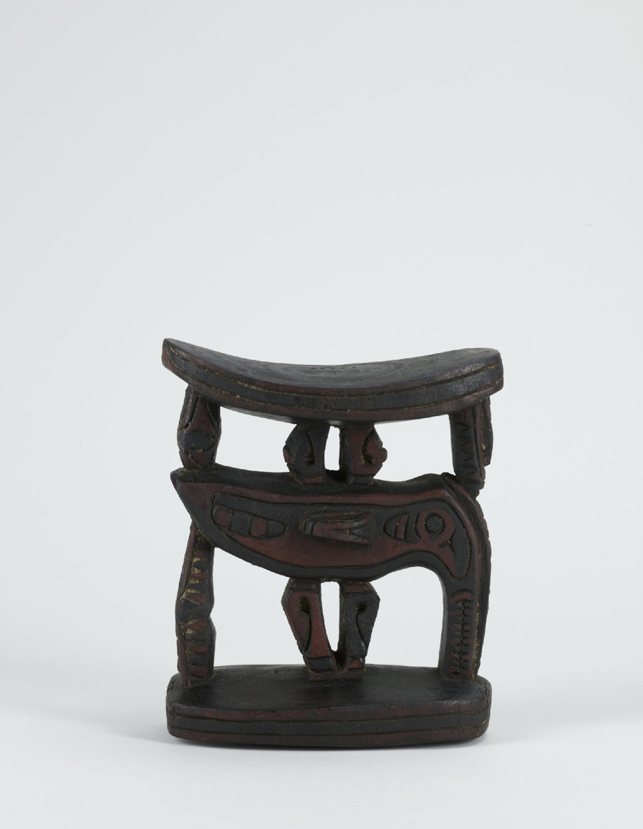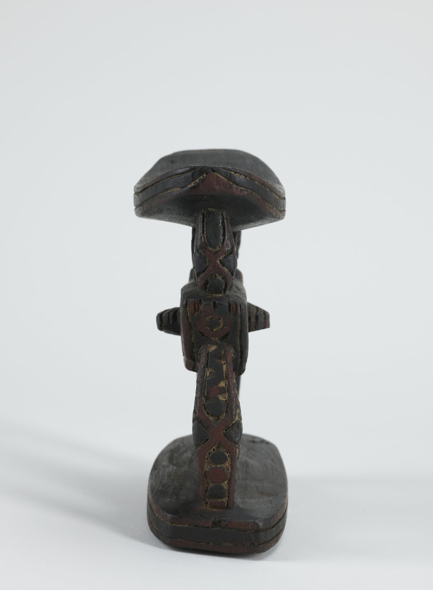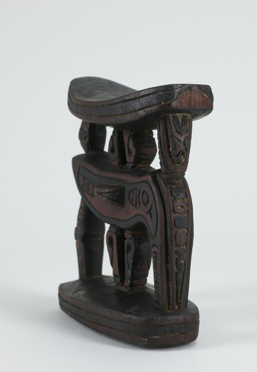 Egy darab keményfából faragva. Színe sötétbarna, helyenként vörös. Felső részét gyengén hajlított, lekerekített szögletű, téglalap alakú lap, alsó részét ugyanilyen, de nem hajlított lap képezi. A két lapot madáralakú faragvány köti össze úgy, hogy a madár csőre az alsó lapra támaszkodik, farka pedig a felső lapot támasztja alá. Fejétől a felső laphoz, farka alatti résztől pedig az alsó laphoz oszlopos faragás vezet, amelyek közül a felső stilizált kígyó vagy emberalakot ábrázol. A faragványok oldalain vörösre és sötétbarnára színezett bemélyített vonalak, körök, bevagdalások láthatók.