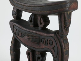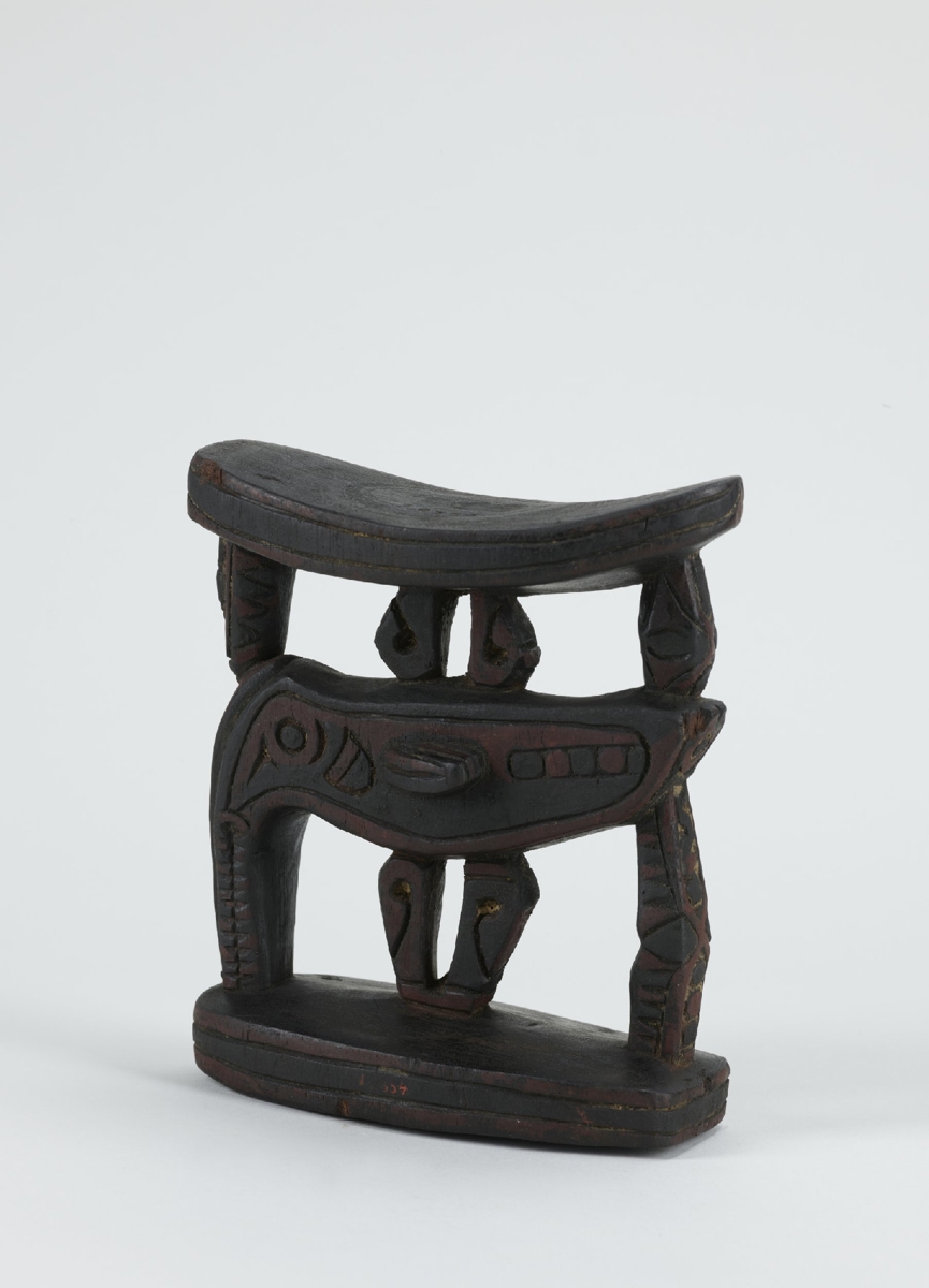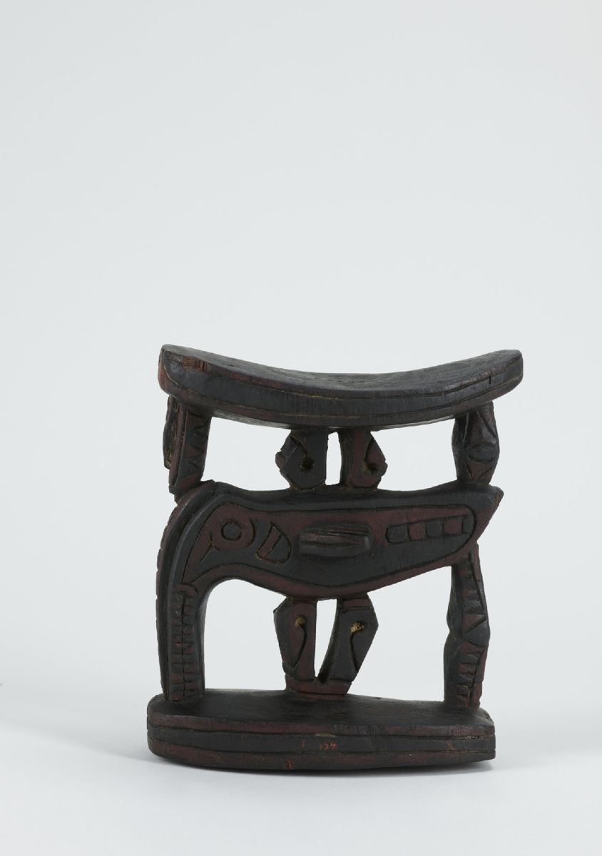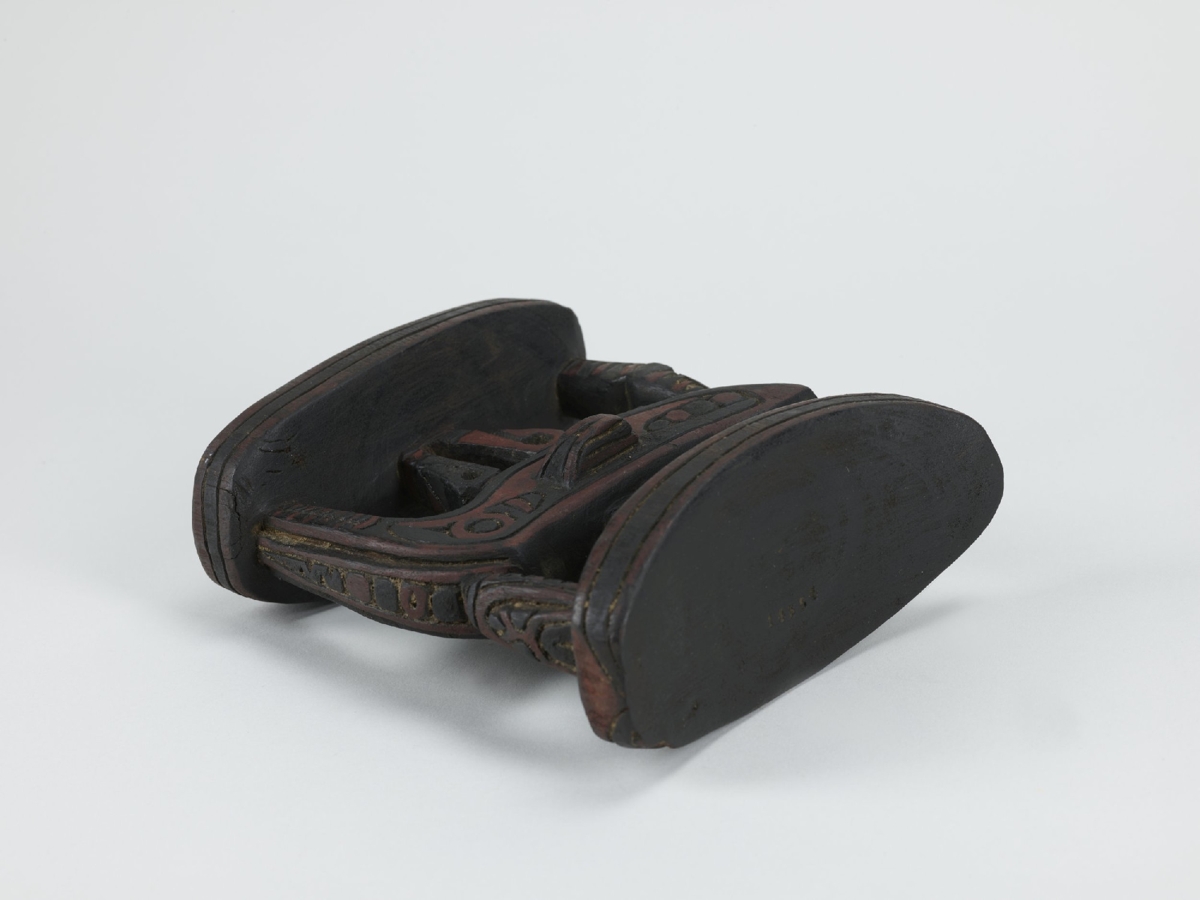 Egy darab keményfából faragva. Színe sötétbarna, helyenként vörös. Felső részét gyengén hajlított, lekerekített szögletű, téglalap alakú lap, alsó részét ugyanilyen, de nem hajlított lap képezi. A két lapot madáralakú faragvány köti össze úgy, hogy a madár csőre az alsó lapra támaszkodik, farka pedig a felső lapot támasztja alá. Fejétől a felső laphoz, farka alatti résztől pedig az alsó laphoz oszlopos faragás vezet, amelyek közül a felső stilizált kígyó vagy emberalakot ábrázol. A faragványok oldalain vörösre és sötétbarnára színezett bemélyített vonalak, körök, bevagdalások láthatók.