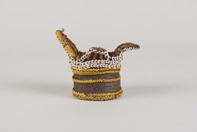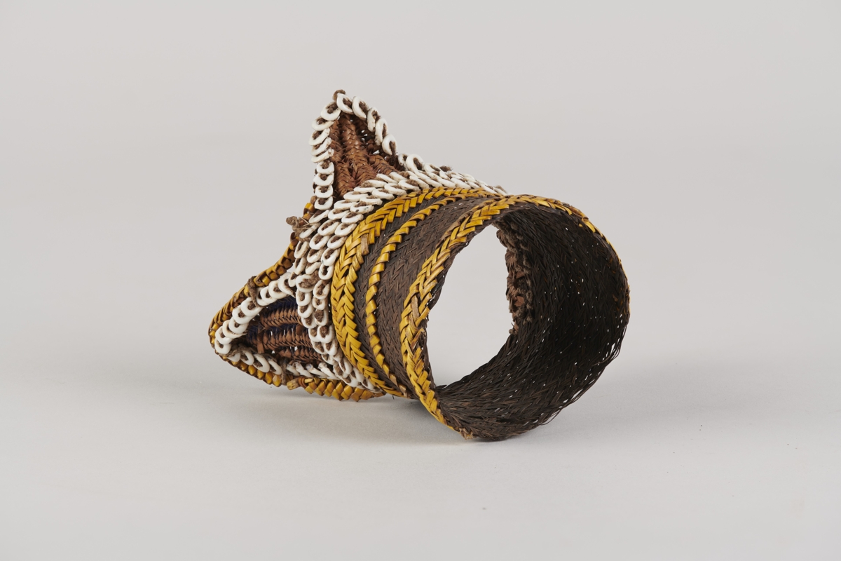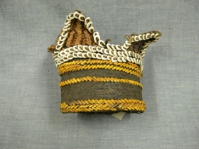 Sötét-barnás színű finom rostfonat három,a felső szegélyre varrott füllel, a fülek egyes, a felső szegélyek kettős kagylóhéjrosttal és három csíkban sárgás színű fonattal diszítve.