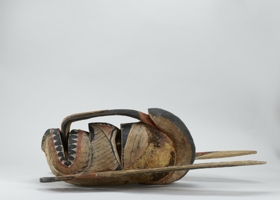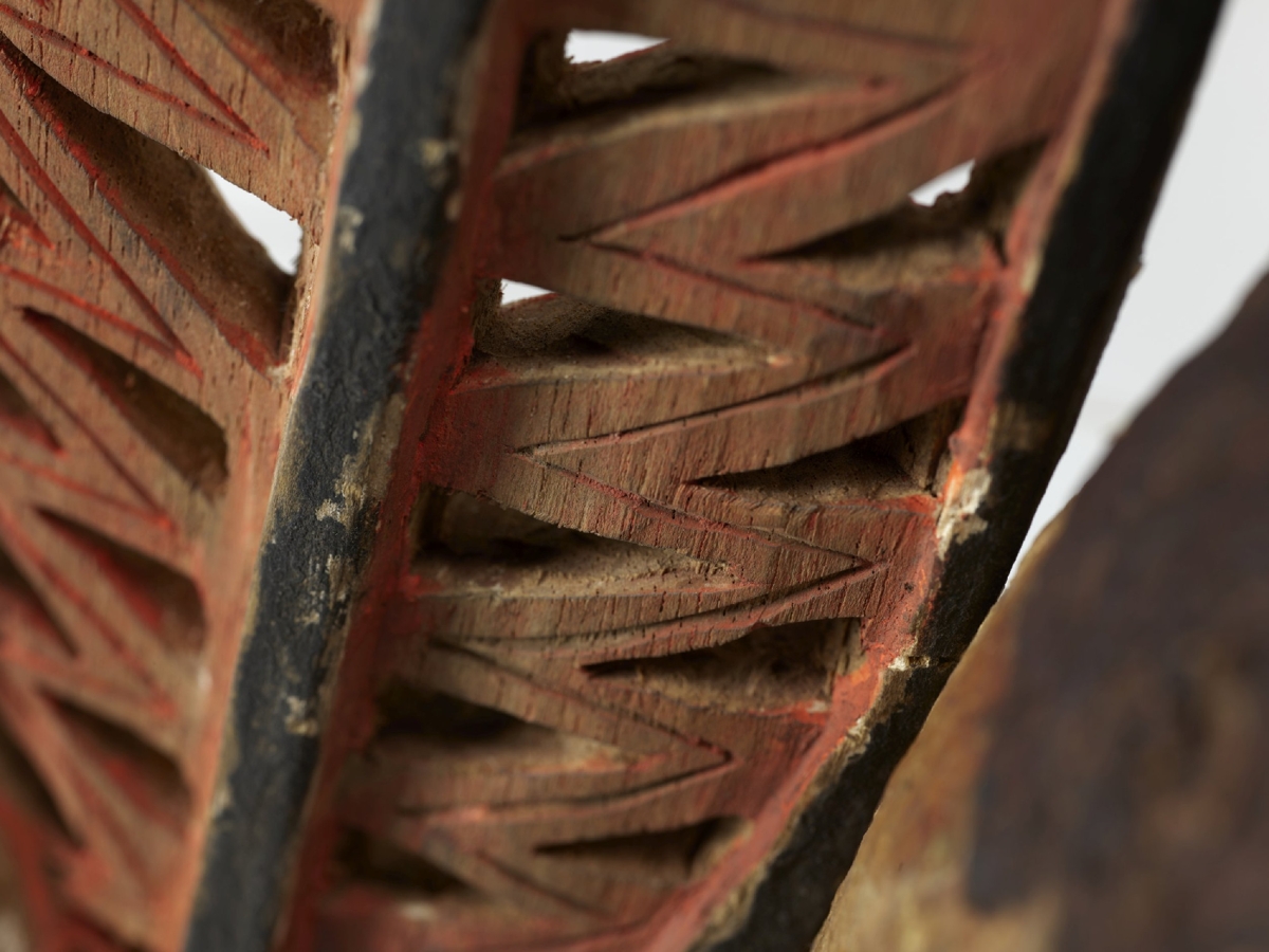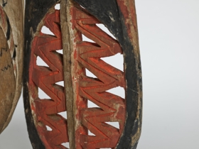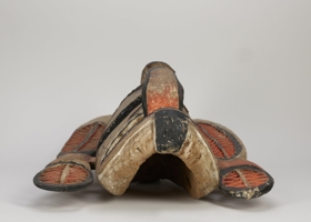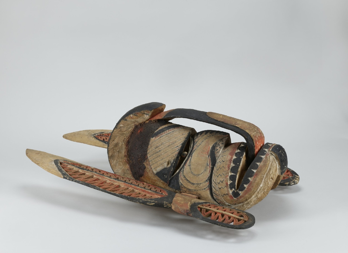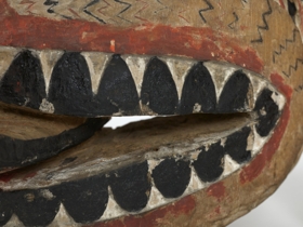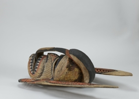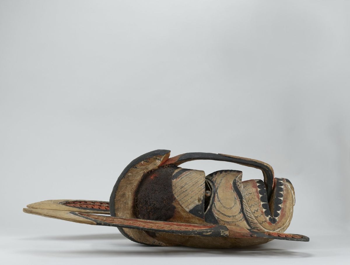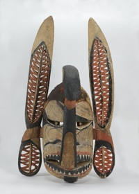 Egy darab fából faragott, hosszúkás, domború, emberarcot ábrázoló tárgy, áttört szem és szájnyílással, a szemnyílásokban zöldes színű kagylóval. Az arc előtt függőlegesen széles, lefelé szélesedő faragvány húzódik, ez alatt foglal helyet a kissé hajlott, nyomott orr. A nyitott szájban változó fekete-fehér háromszögek jelzik a fogakat. Az arcot vörös-fekete-fehér vonalas motívumok díszítik. A fejtetőn hátrafutó, széles taréj. Kétoldalt a maszk oldalrészébe vágott lyukba erősített, áttörten megmunkált, vörös-fekete színű nagy, kettős oválisokból összetevődő fülek.