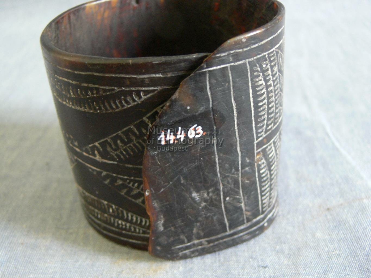 Hengeresre hajlított teknőshéj. Szine sötétbarna, világossárga foltokkal. Végei egymásra hajlanak. Külső felületén vésett motívumok díszítik, kopott inkusztációval: középen két kalikali csik fut, kijebb apro vonalkával díszített szalag. A két külső részben fennmaradó négyszöget a hosszanti oldallal párhuzamos 2 vonal vágja ketté, a fennmaradó részeket apró vonalkák töltik ki, egy X kihagyva.