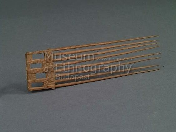 Egyetlen darab keményebb fából faragott, felül áttört és apró bevésett motívumokkal díszített, lapos, szögletes forgórészhez csatlakozó nyolc hegyes végű, hengeres fog.