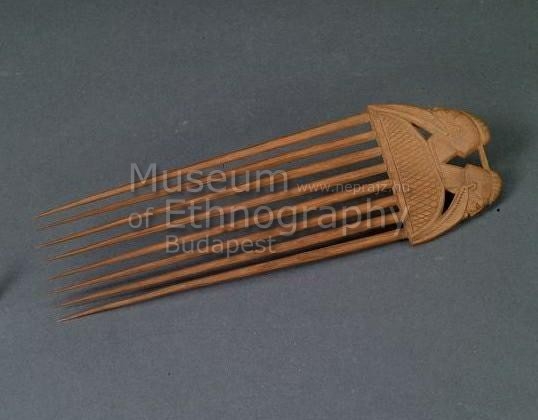 Világos színű keményfából faragott, nyolcágú, lapos fésű. Fogója két szakállas, egymásnak hátat fordító férfifejet ábrázoló. Közölve : Bodrogi 1959:142. tábla és Bodrogi szerk. 1981:123, 98. rajz.