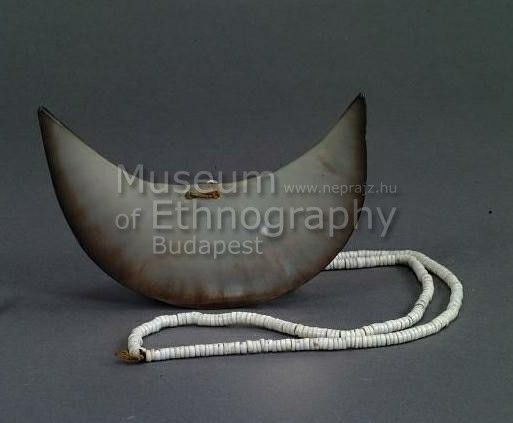 Félhold alakban kivágott gyöngyházkagyló (Pinctada margaritifera?) felül középen a két lyukon áthúzott, rostzsinegre fűzött csigapénz gyöngyös lánccal.