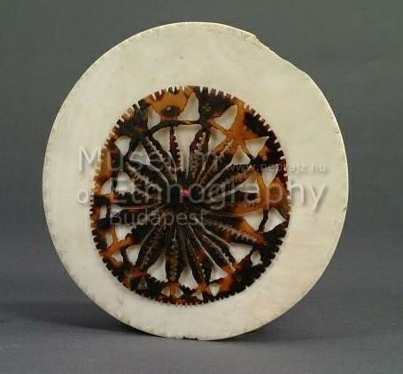 Tridanca gigas kagyló házából csiszolt vékony korongra rostzsineggel és egy piros gyöngy segítségével felerősített, áttört, küllős mintájú teknőspáncél lemez.