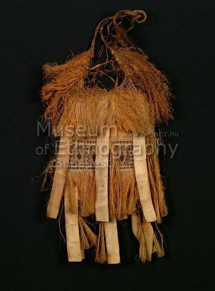Finom szálú növényi rostból (valószínűleg banán) szőtték, barnás színűre festett szálakkal kialakított mintával. Felső és alsó pereméhez széles levélcsíkokat (banán vagy pandanusz) rögzítették, középen összecsomózott rostzsineg füllel és díszítőrojtokkal látták el.