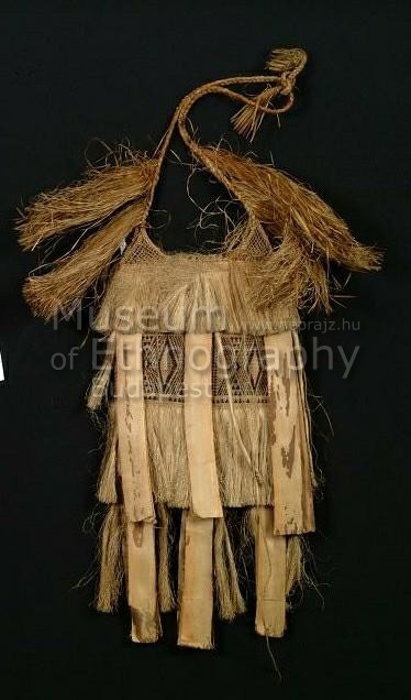 Finom szálú növényi rostból (valószínűleg banán) szőtték, barnás színűre festett szálakkal kialakított mintával. Felső és alsó pereméhez széles levélcsíkokat (banán vagy pandanusz) rögzítették, középen összecsomózott rostzsineg füllel és díszítőrojtokkal látták el. (Bodrogi 1959:125 tábla; „Vanikoro” szerepel származási helyként).