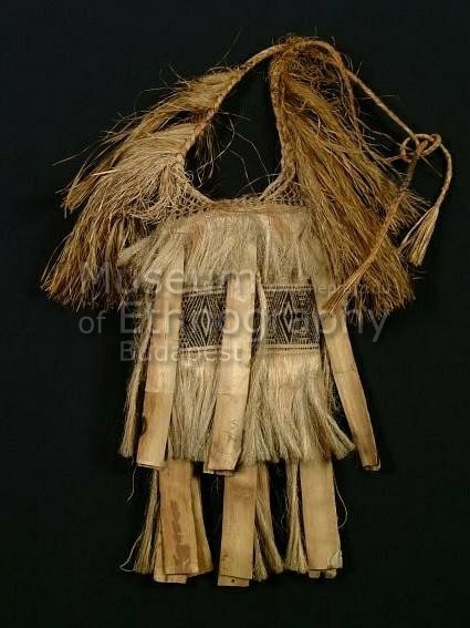 Finom szálú növényi rostból (valószínűleg banán) szőtték, barnás színűre festett szálakkal kialakított mintával. Felső és alsó pereméhez széles levélcsíkokat (banán vagy pandanusz) rögzítették, középen összecsomózott rostzsineg füllel és díszítőrojtokkal látták el.