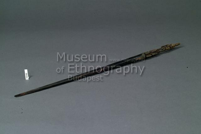 Barnás-fekete keményfából faragták, lapátszerű véggel; nyelén férfialak.