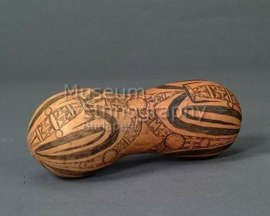 Homokóra alakú, sárgásbarna töktermés, egyik végén kis lyukkal. Felületén bekarcolt és feketére színezett minták.