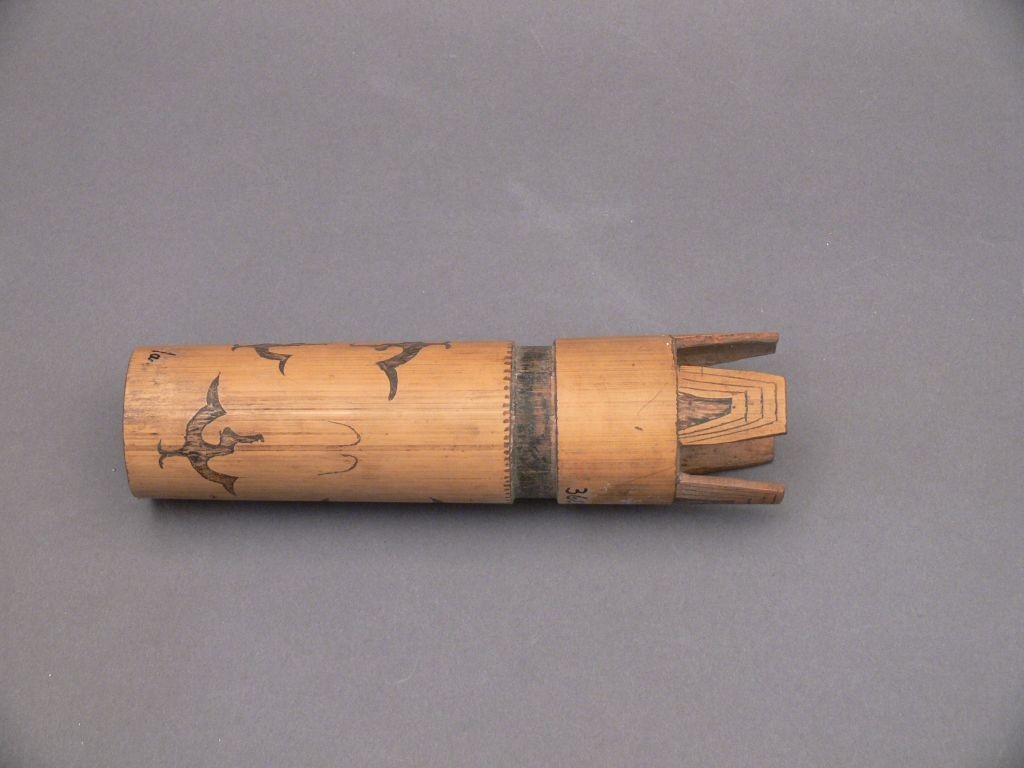 Világosdrapp színű bambuszcső, alja kerek falap, kupakja szintén falappal záródik. Tartórészén bekarcolt és sötétre színezett geometrikus motívumok, állatfigurák.