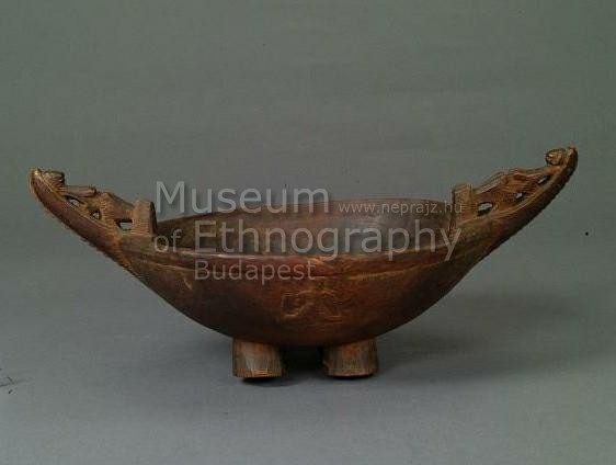 Négy alacsony, hengeres lábon álló, ovális, sötétbarna fatál, pereme alatt kívülről körbefutó vonal, illetve a palaquiumdióból készült függődíszt ábrázoló faragás. Fogói felhúzott lábaikra könyöklő antropmorf állatfigurák.