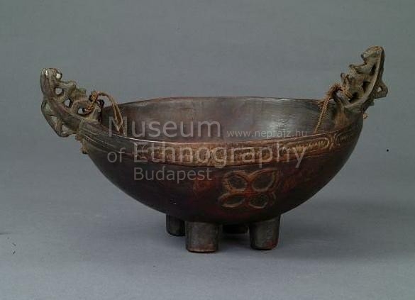 Keményfából faragott, barnás-fekete, ovális tál, négy alacsony, hengeres lábon. Fogói stilizált testű, felhúzott lábú, könyöklő emberalakok. Az edény peremén szalagszerűen körbefutó bevésett geometrikus minta, alatta világszerű motívum, domború faragással, túloldalán domború korongforma dísz. A fogókhoz felfüggesztésre szolgáló rostzsinórt erősítették.