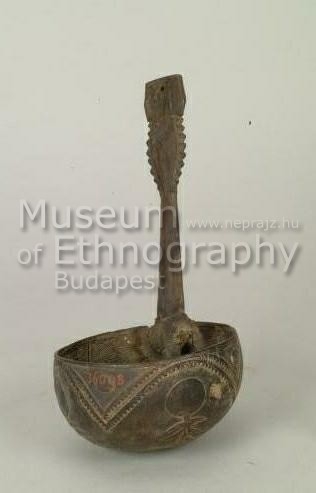 Félbevágott, száraz kókuszdióhoz rostzsineg és parinariumgyanta segítségével faragott fanyelet erősítették. A dió külső felületét bevésett és domború faragású minták díszítik. A bemélyedő részeket mészporral töltötték ki.