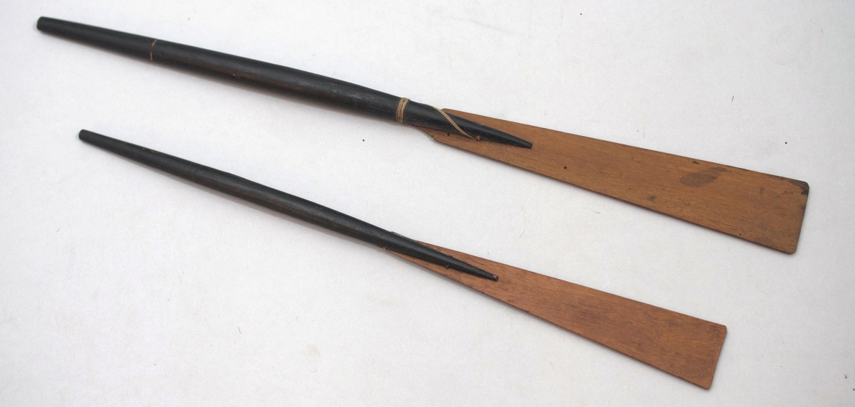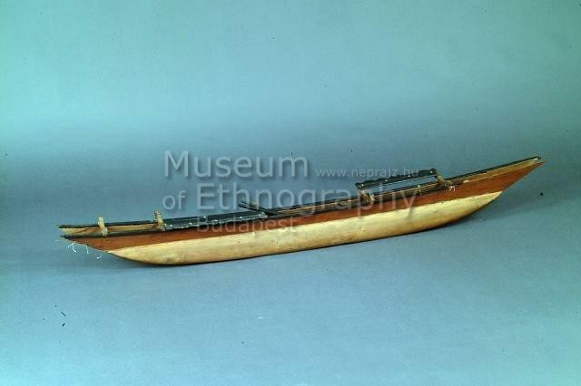 Világos puhafából kifaragott karcsú hajótest, melyet kétoldalt hosszában egy-egy falemezzel magasították meg. A kívül pirosra festett lemezeket rostzsineggel erősítették a csónaktesthez, erre illesztették a feketére festett szegélylécet. A csónak peremét eredetileg több, jelenlegi állapotában azonban már csak öt keresztléc hidalja át, közülük kettőn egy-egy oldalon víz fölé nyúlócakkos szélű peremmel. A csónak ülései közül csak egy marad meg. A két evezőlapátot részből állították össze: fekete festésű hengeres nyélhez cérnával erősítették a szögletes végű, vékony falemezből készült lapátrészeket.