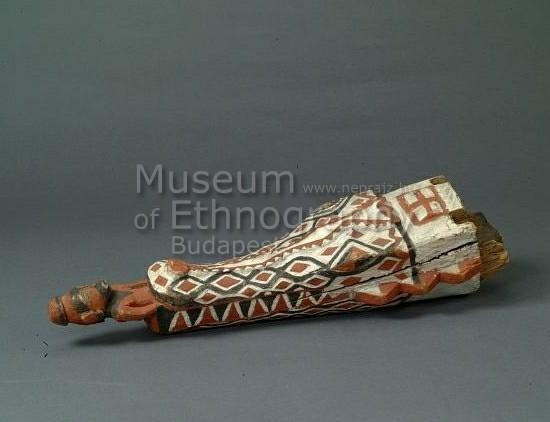 Világos, puhafából faragott krokodilfej, szájában derékig elnyelt férfialakot ábrázoló faragvány, piros, fehér és fekete festéssel. A krokodilfej tövénél a csónakhoz való illesztésre szolgáló lapos, kiálló rész.