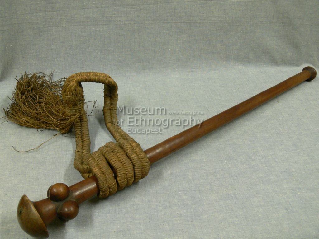 Világosbarna keményfából készült, egyenes vonalú, megközelítőleg kör keresztmetszetű buzogány. A nyél a markolatgomb, illetve az ütő rész felé enyhén vastagodó. Az ütő rész gombafejű. A gomba alatt 55 mm-re négy darab 34 mm hosszú, 27,4 mm széles, és 25 mm magas 'bütyök' található, a nyél kerületén körben arányosan elosztva. A nyélen növényi szálból készült, többszörösen áttekert fonat, amelynek a csomós végét 220 mm hosszú rojt díszíti.