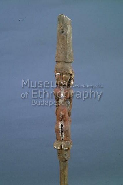 Viszonylag puhafából faragott, lábait enyhén behajlító férfit ábrázoló faragvány. Karjai szorosan a lábaihoz simulnak. Fején és a talpak alatt elnagyoltan kifaragott szögletes csonkok, melyek arra utalnak, hogy a mondabeli őst ábrázoló figura a férfiház valamilyen berendezési tárgyának, esetleg a ház szerkezetének része lehetett. Piros festésű testét mészbetét díszíti, arcán kétoldalt testfestést idéző bevésett csillagminta. Felső karjain karperecekre utaló vonalak, tarkóján stilizált harci dísz.