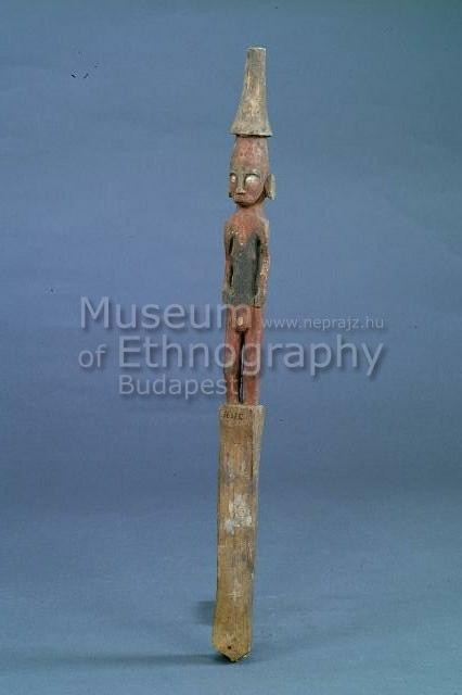 Puhafából faragott férfialak, fején kúp alakú, talpa alatt szögletes tartórész. Törzsét feketére festették, a test többi részét piros és fehér festés díszíti, arcán és mellén bevésett geometrikus minták, felső karján karpereceket jelző vonalak, fején stilizált tarkódísz.