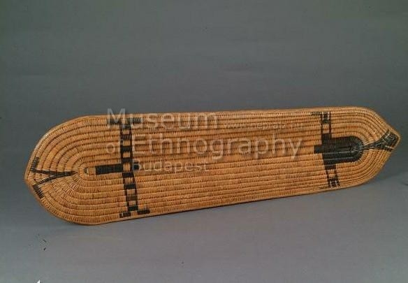 Lekerekített, egyik végén enyhén ívelt téglalap alakú. Készítési technikája – Spirális fonat – a kosarakéhoz hasonló. A pajzs alapját adó körkörös fonat nyersanyaga puhafa vessző vagy lián. Hátoldalán középen keresztben háncscsíkkal betekert fogórészt alakítottak ki a kéz számára. Elöl és hátul, két hosszanti végén fekete festésű motívumok díszítik. Hasonló, az 1850-es évekből datált példányt mutat be Rovianáról (New Georgia) Waite ( 1983:120, Nr. 15, ltsz.: 4525, Musée Barbier-Mueller, Geneve).