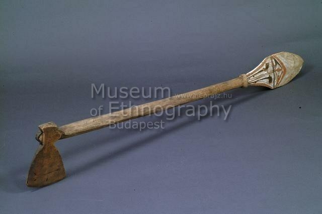 Vajszínű, nagyon könnyű és puhafából faragott, hengeres nyelű, egyik végén európai vasfokost utánzó faragással, másik, evezőlapátszerűen kiszélesedő végén bevésett és piros, fekete festékkel, illetve fehér kagylómésszel kiszínezett, a kokorramintára emlékeztető rajzolat, mindkét oldalán. Festetics közli a fotóját a múzeumnak küldött tárgyak között. (Festetics De Tolna 1904).