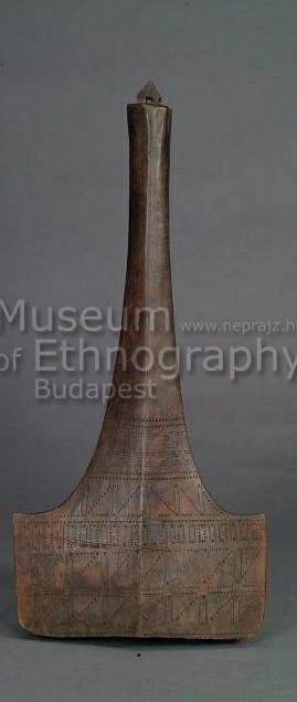 Sötétbarna keményfából faragott, hengeres nyelű, legyezőszerűen kiszélesedő lapos fejrészén mindkét oldalon ék alakú, bevágott geometrikus mintákkal.
