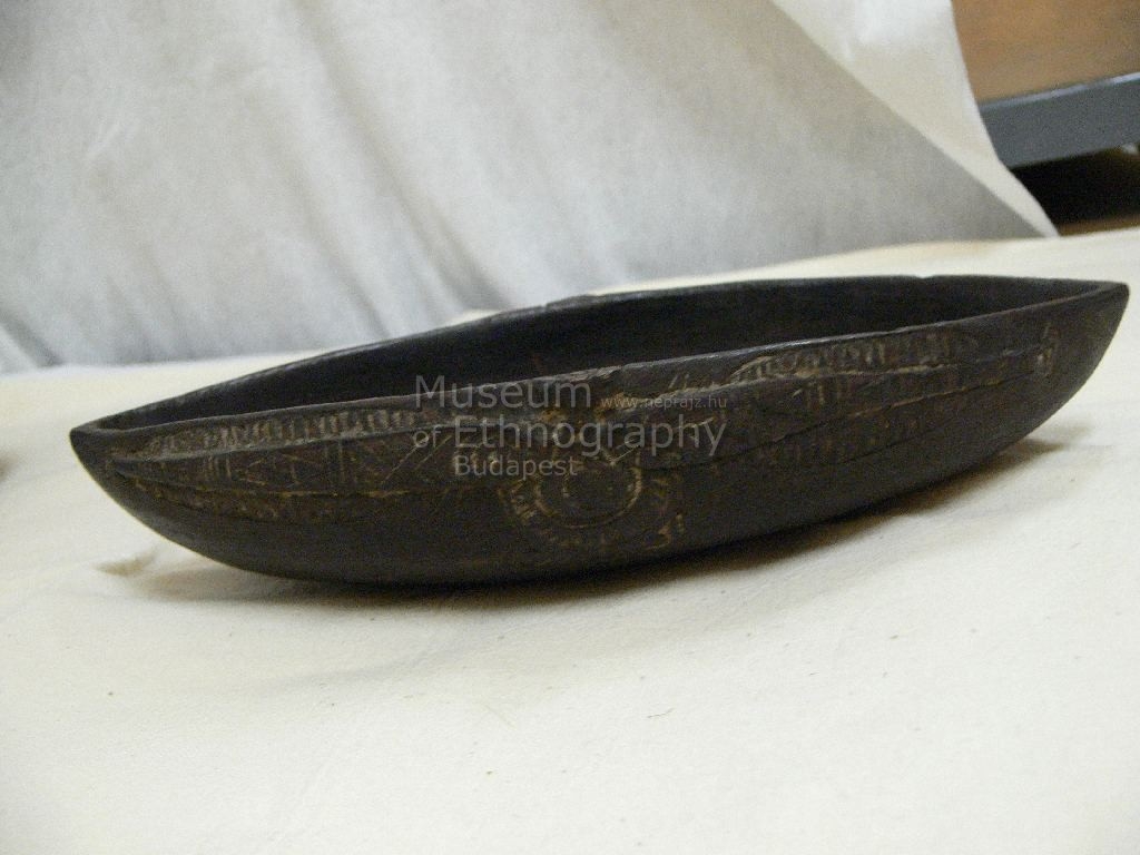 Egyetlen fatömbből kivájt tál. Oldalát felületéből enyhén kiemelkedő, egymással szemben megfaragott halábrázolások díszítik, melyeket fehér és vörös festéssel emeltek ki.