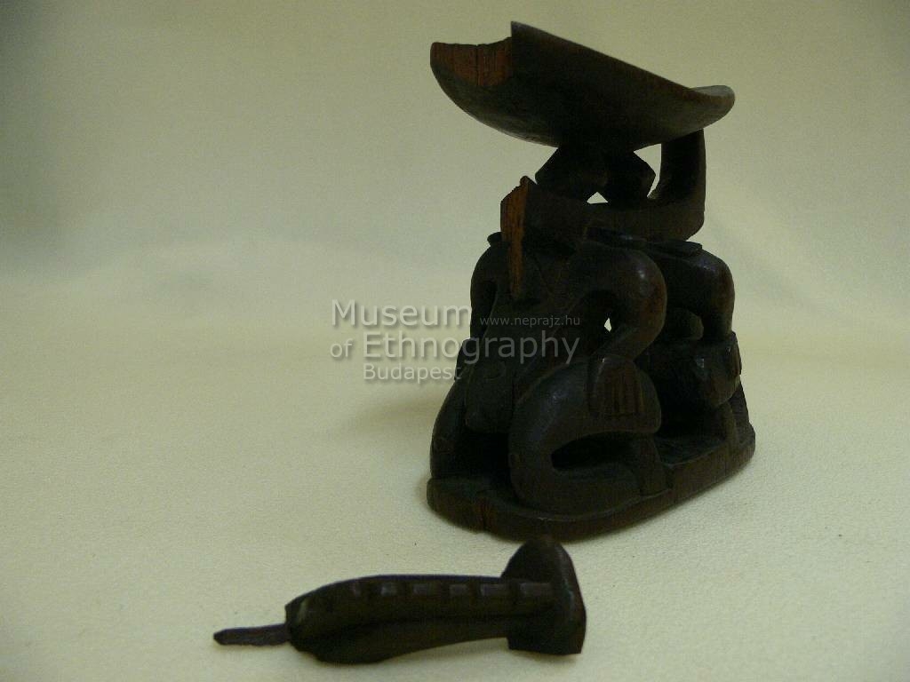 Egy darab keményfából faragott fejtámasz. Színe sötétbarna. Felső részét enyhén hajlott ovális alakú, alsó részét téglalap alakú lap képezi. A lapokat két, egymásnak hátat fordító guggoló ember alakú faragvány köti össze. Ezek fején a felső laphoz kapcsolódó íves faragvány van, aminek közepén két romboid alakú faragvány van. Az emberalakok elnagyoltak, egyik a feje hiányzik. Az egyik mellén kettő, hasán egy, térdein kettő kör alakú bemélyedés látható az izületek jelzéseként. A félkörívet két oldalt cakkos, faragott sorminta díszíti.