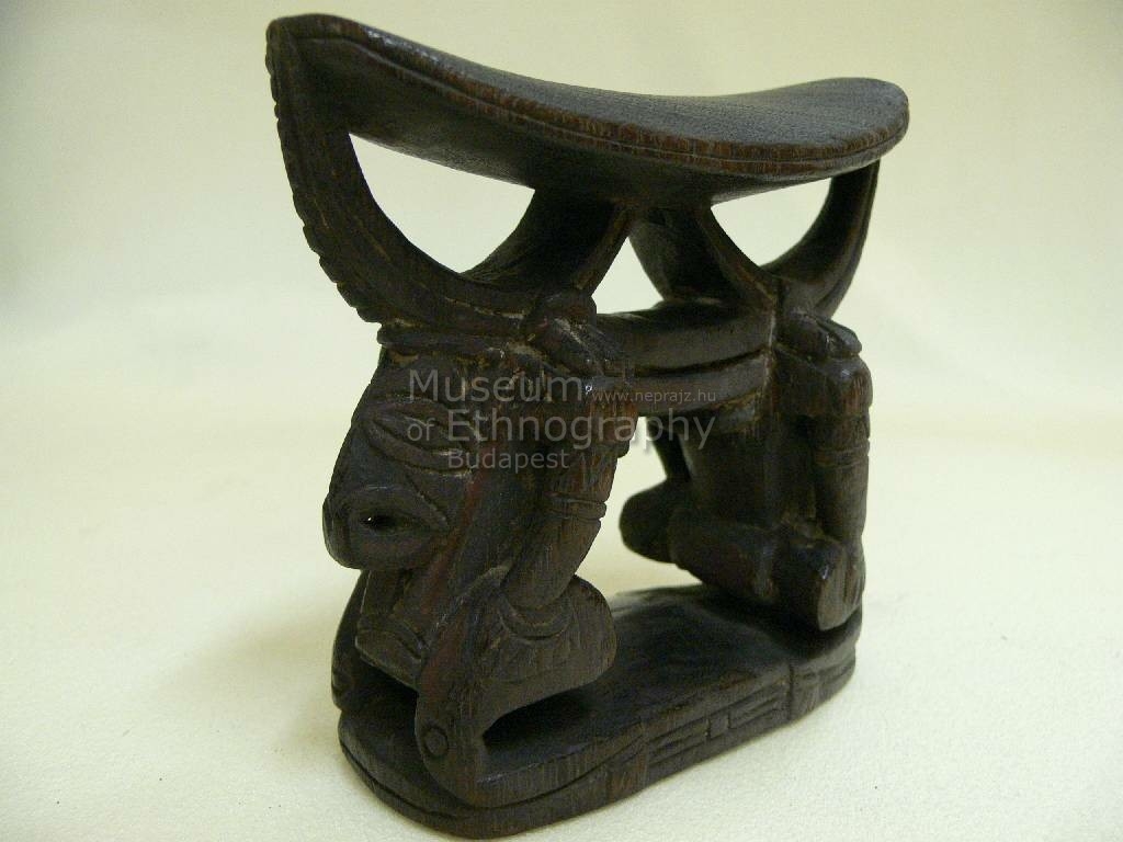Egy darab keményfából faragva. Színe sötétbarna és vöröses. Felső részét hajlott ovális alakú lap, alsó részét lekerekített sarkú téglalap alakú lap képezi. A lapokat geometrikus faragványok kötik össze. Ezek alsó része nagyméretű lefelé nyitott ív, amely középen zárt alul négy ponton támaszkodik. Végei kígyófejet ábrázolnak, közepén pedig egy-egy emberfej. Ezen két, felefele nyitott ív, van egymásmellett elhelyezve, oldalain stilizált jabofaragványokkal. Felületek hullámvonallal vannak díszítve.