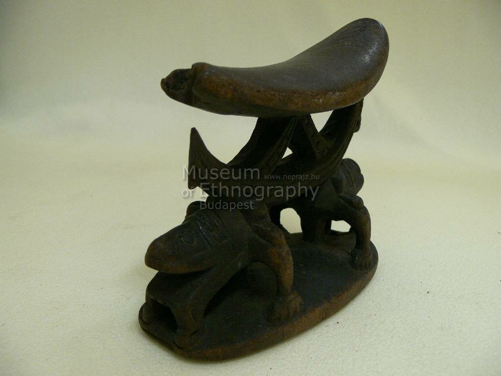 Egy darab keményfából kifaragva. Szine sötétbarna. A fejal felső részét erősen hajlott ovális alakú, alsó részét lekerekített szélű téglalap alakú lap képezi. A két lapot összekötő részt két, háttal egymásfelé fordult erősen stilizált emberalak. Kezükkel hátra támaszkodnak, fejük erősen előre ugrik. Ezek fején húzódó félkör és belül támasztékkal ellátott faragás köti össze. Lábukkal és karjukkal hátrafelé támaszkodnak a talapzatra, arcrészük kiugrik. Felső része az egyik oldalon törött.