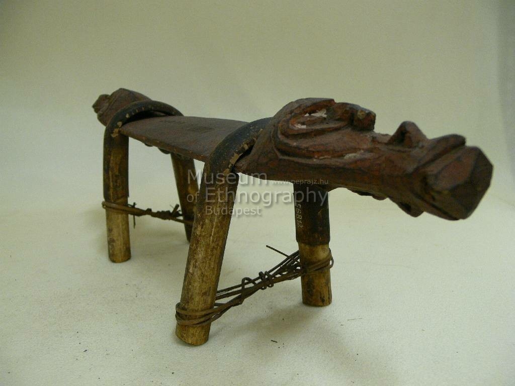Felső lapja sötétbarna keményfa lap, végén fekvő, stilizált emberalakkal. Lábait két, vastag ágdarab képezi, amelyek a lap tetejét átívelve két oldalt függőlegesen állva képezik a lébakat. Ezeket alul kötél fogja össze.
